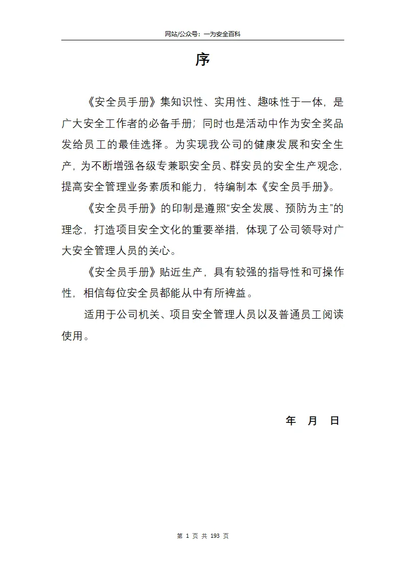 这篇《2026版安全员手册》是一部集知识性、实用性和指导性于一体的综合安全指南,旨在提升企业及项目安全管理人员的业务素质和安全观念。文档内容涵盖了从安全员的基本职责到具体操作规程的全方位安全管理知识,主要包含以下核心部分: