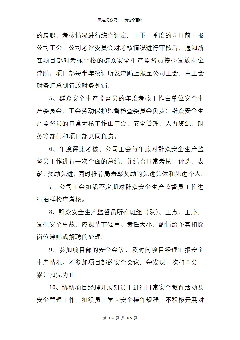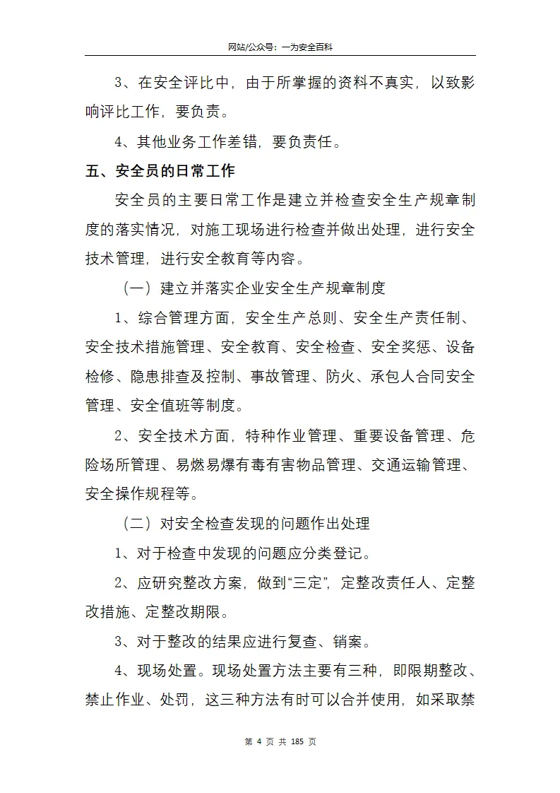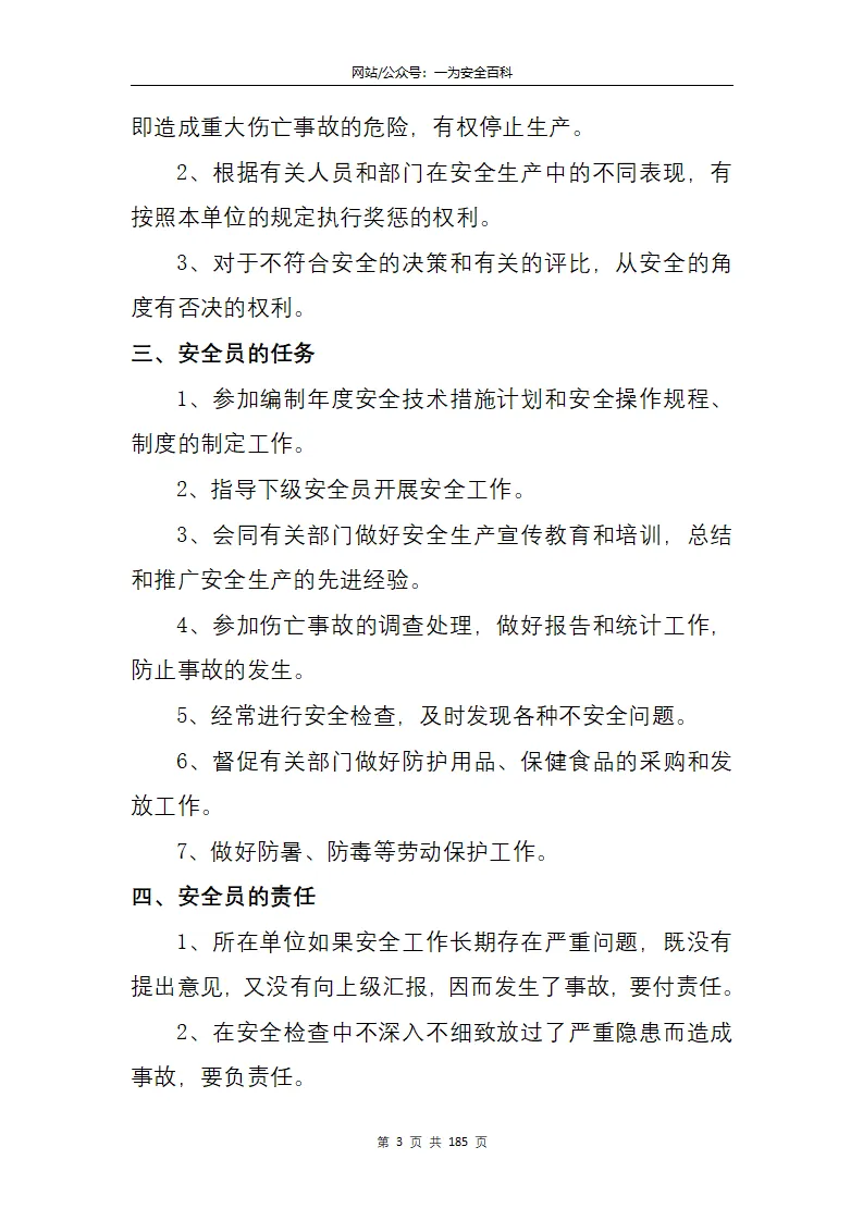 赋予了安全员检查权、奖惩权和否决权,并详细列出了其日常任务(如制度建立、隐患排查、教育培训、事故处理等)和责任追究机制。