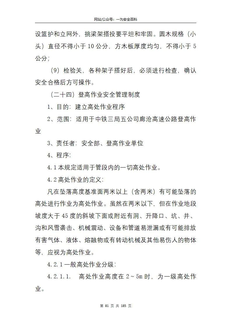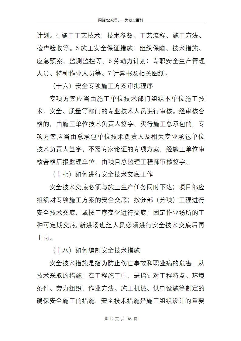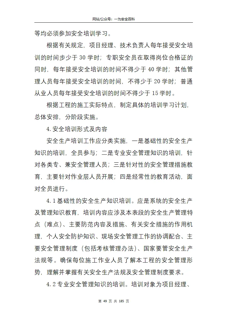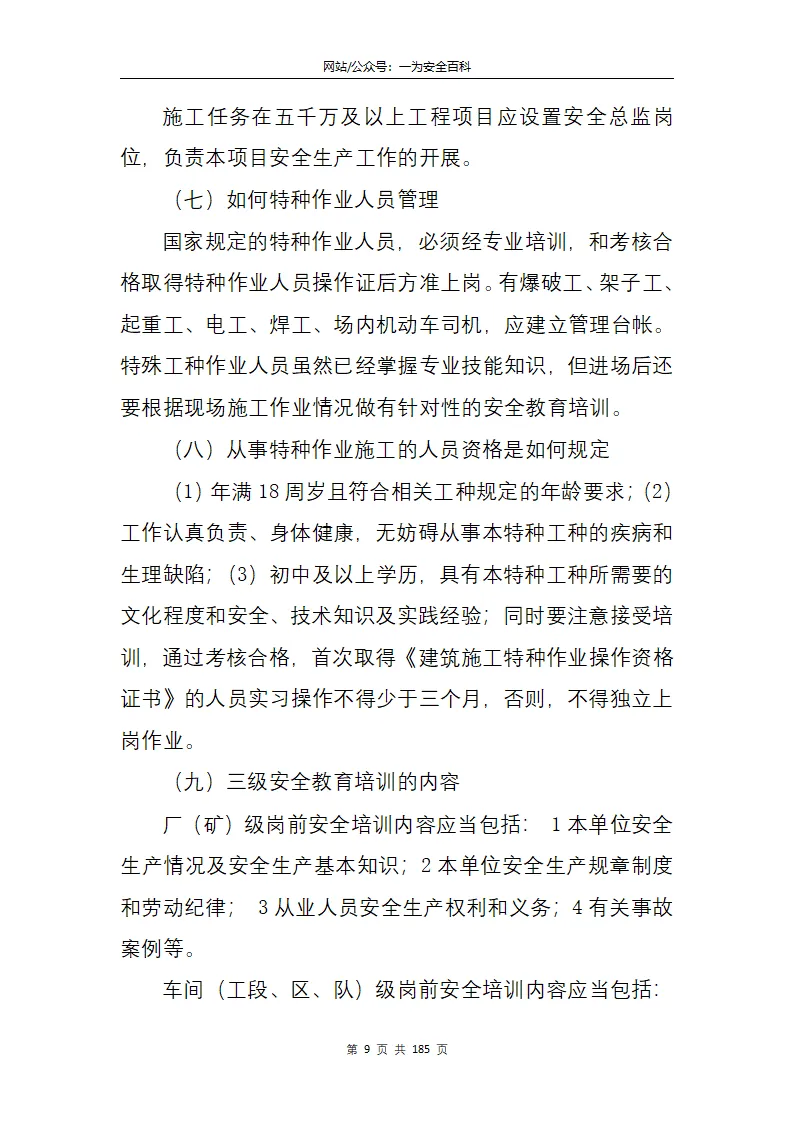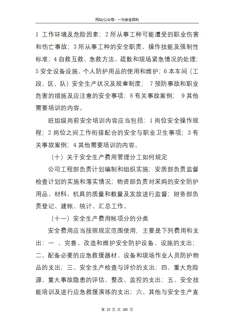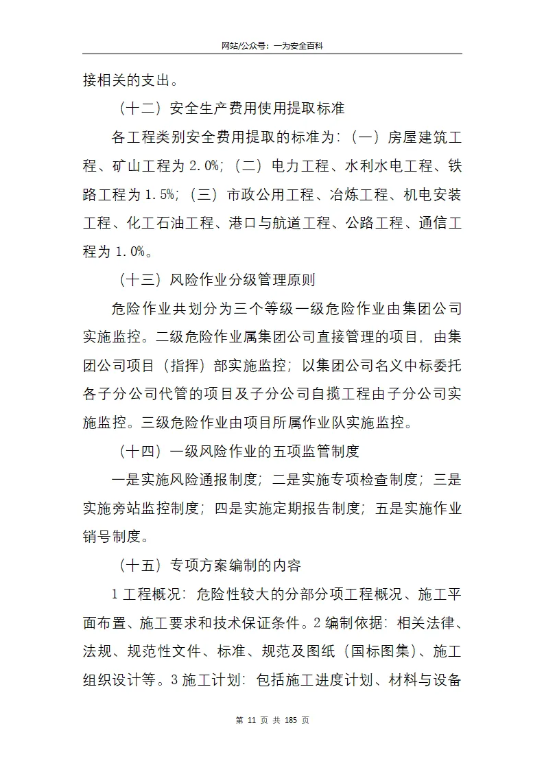 介绍了三级安全教育、特种作业人员管理、安全生产费用提取标准(不同工程类别比例不同)、风险作业分级管理及专项方案编制审批流程。