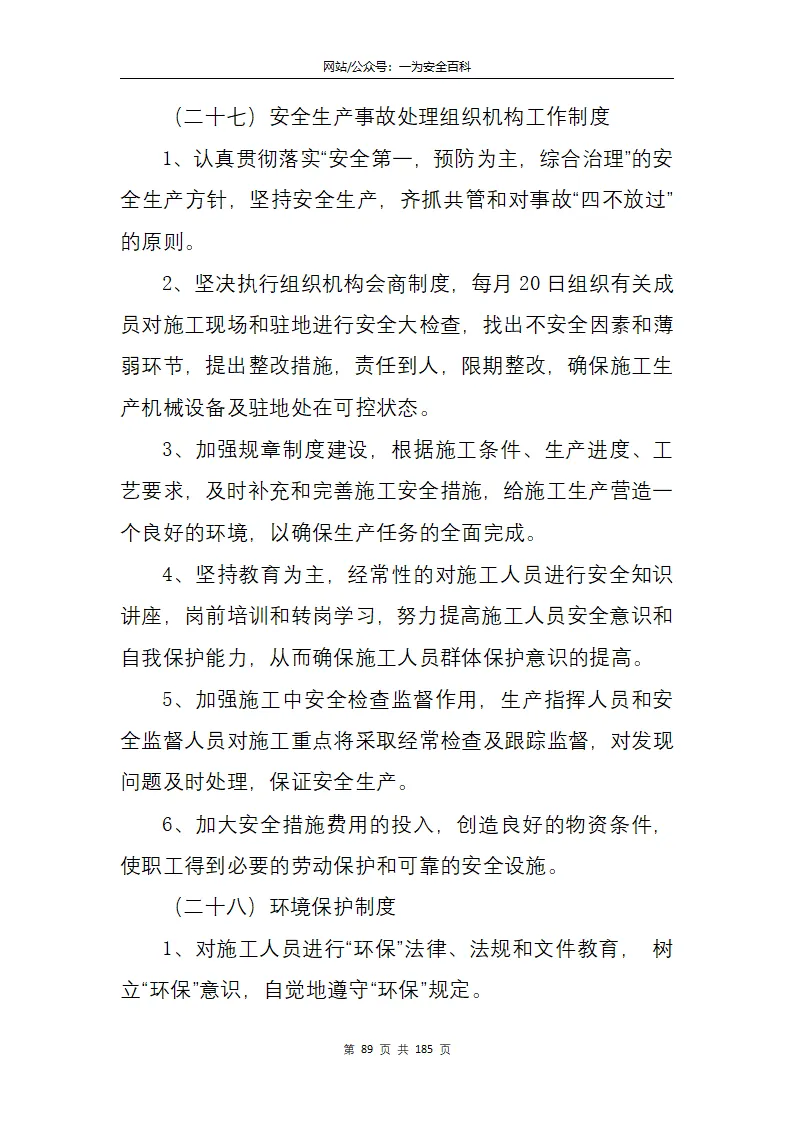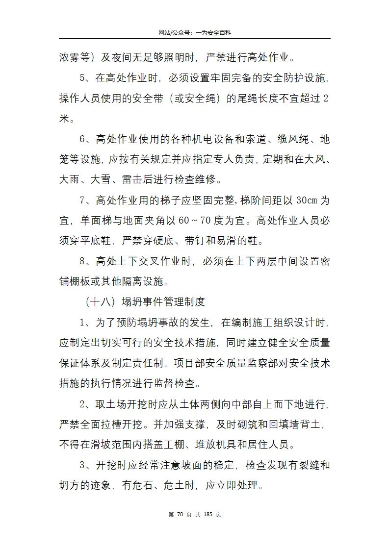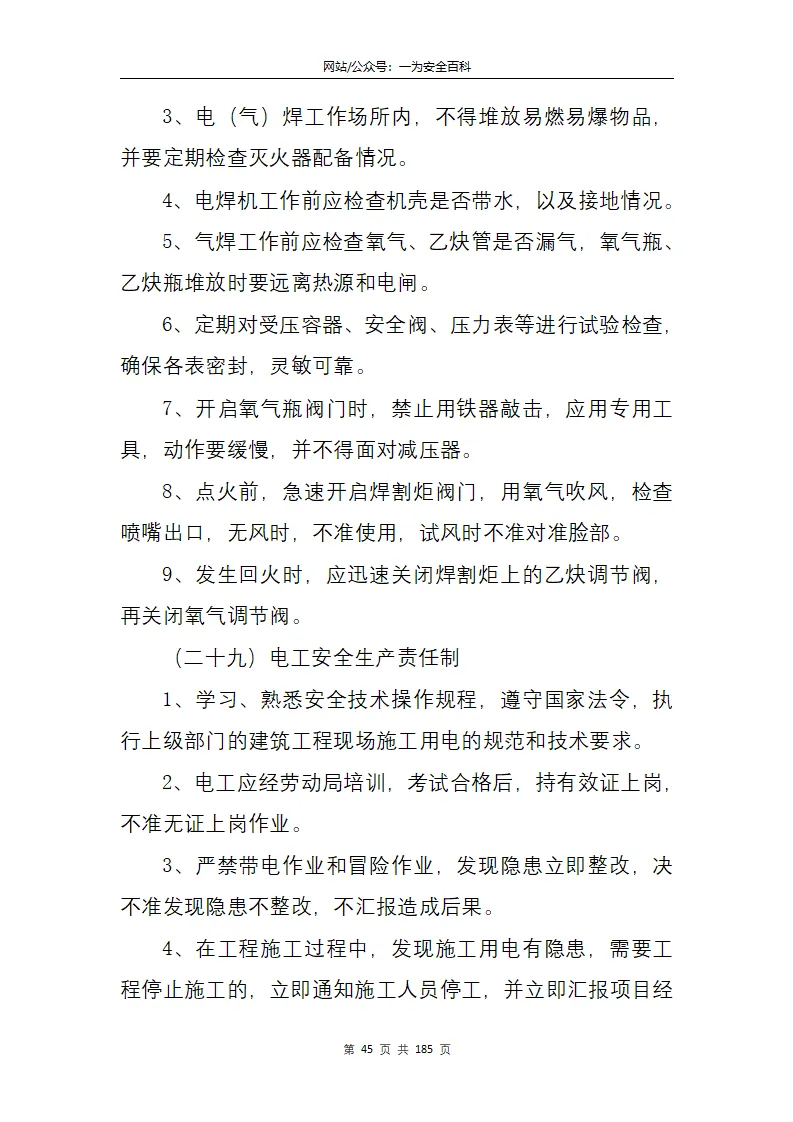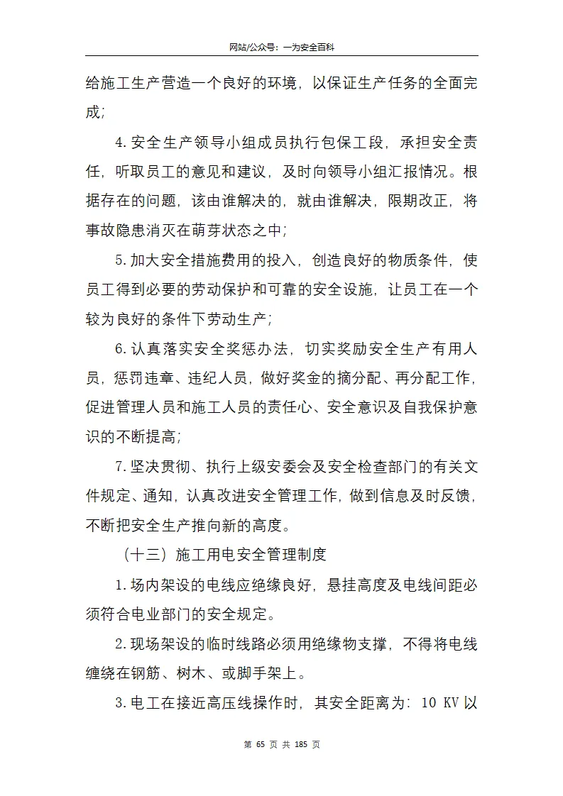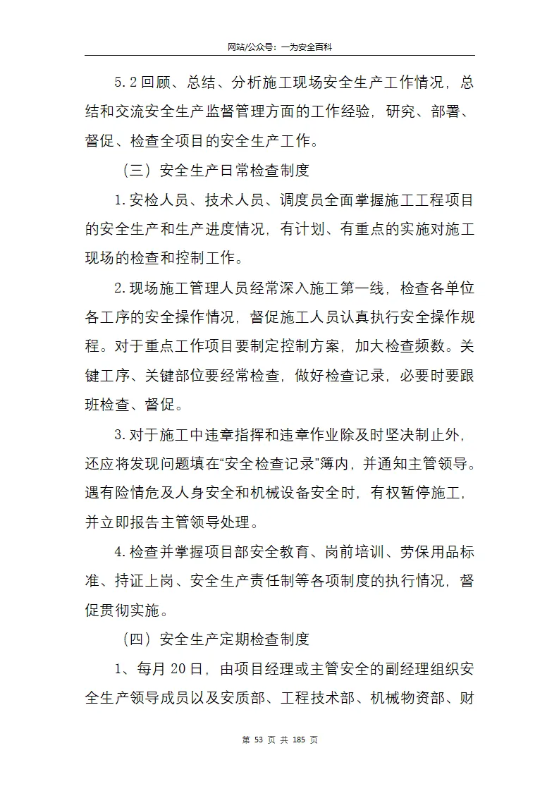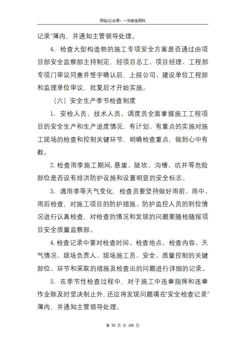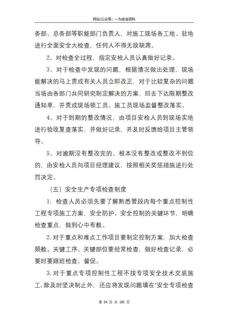 建立了全套管理制度,包括全员培训、会议制度、各类检查制度(日常、定期、专项、季节)、隐患排查整改、事故报告与调查处理、奖惩制度、安全技术交底、特种作业持证上岗、安全防护用品管理、消防责任、危险源监控、应急预案演练及意外伤害保险等近四十项制度。