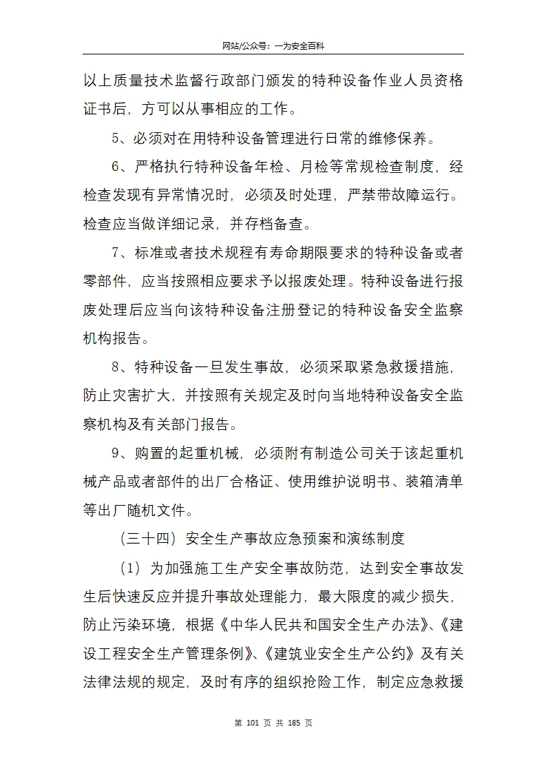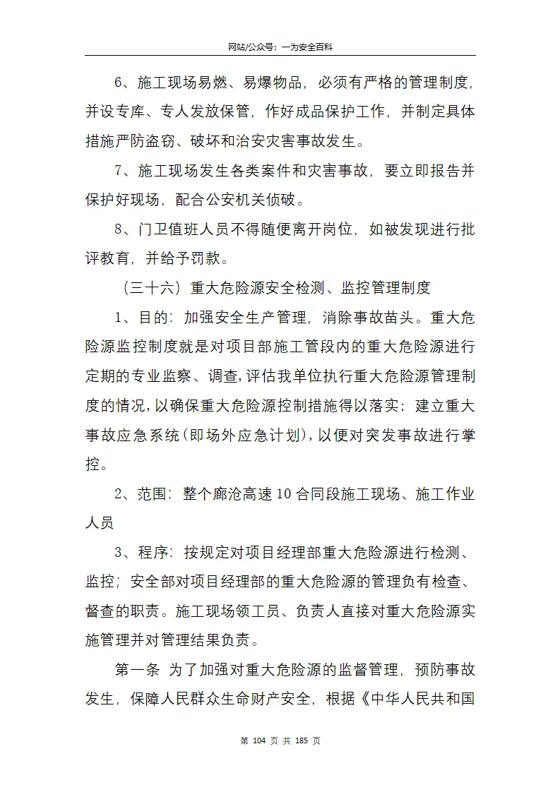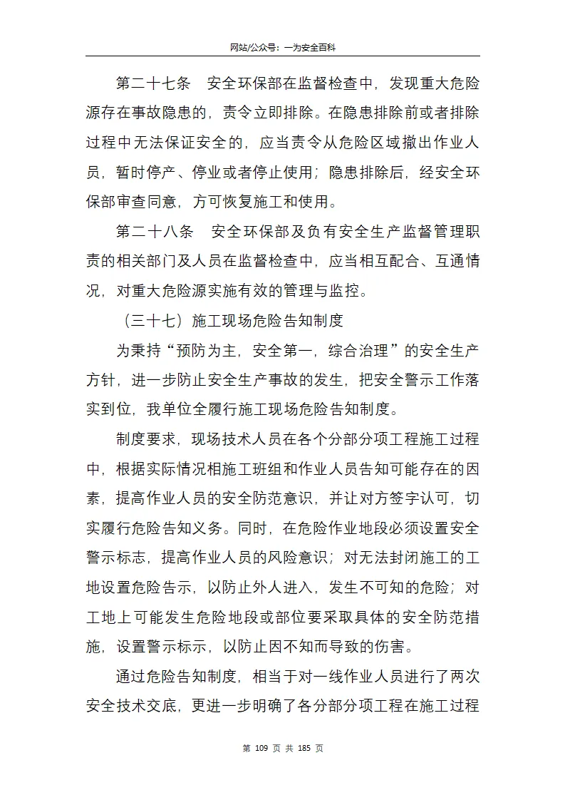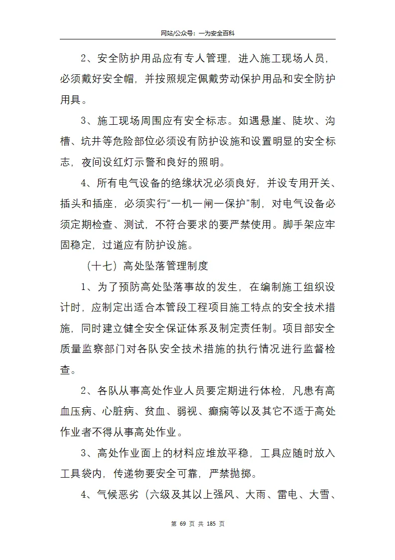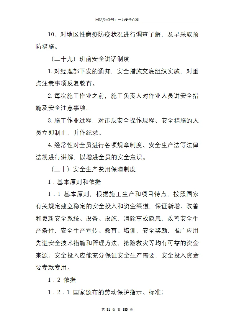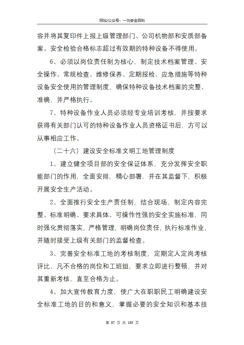 建立了全套管理制度,包括全员培训、会议制度、各类检查制度(日常、定期、专项、季节)、隐患排查整改、事故报告与调查处理、奖惩制度、安全技术交底、特种作业持证上岗、安全防护用品管理、消防责任、危险源监控、应急预案演练及意外伤害保险等近四十项制度。
