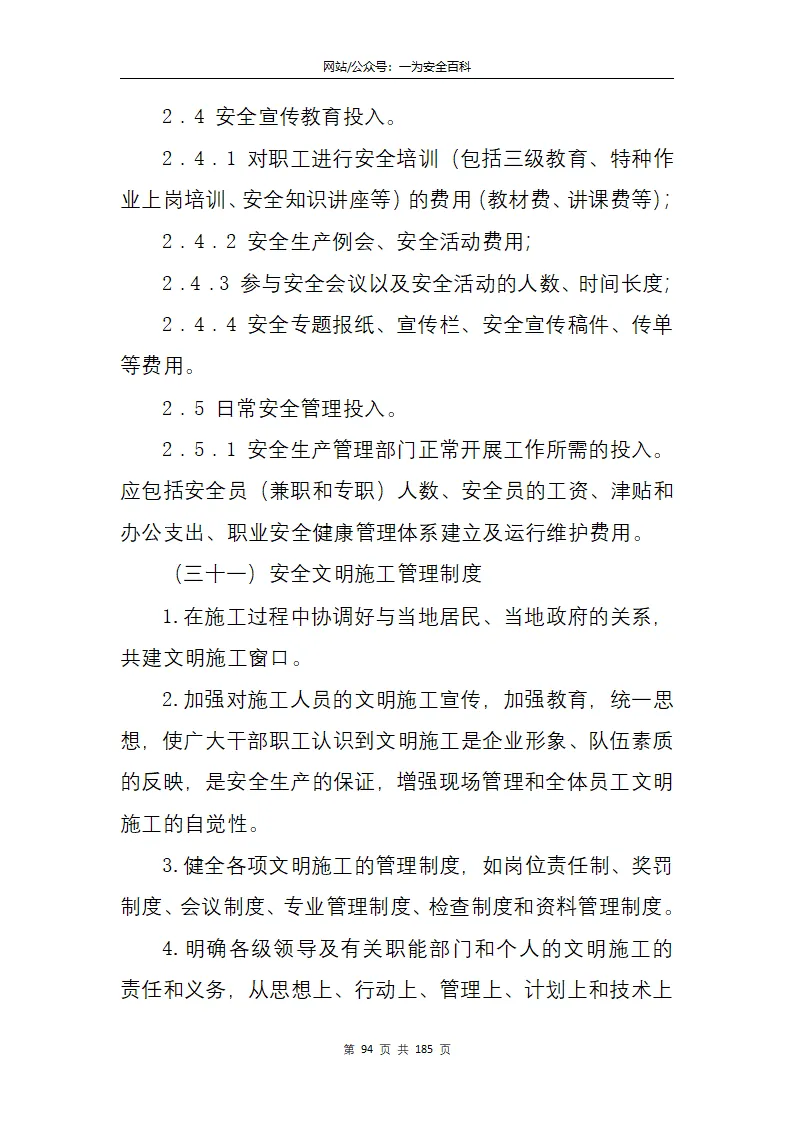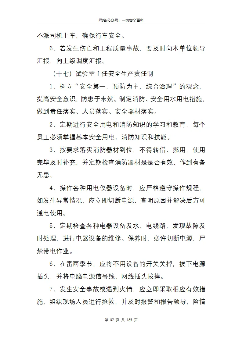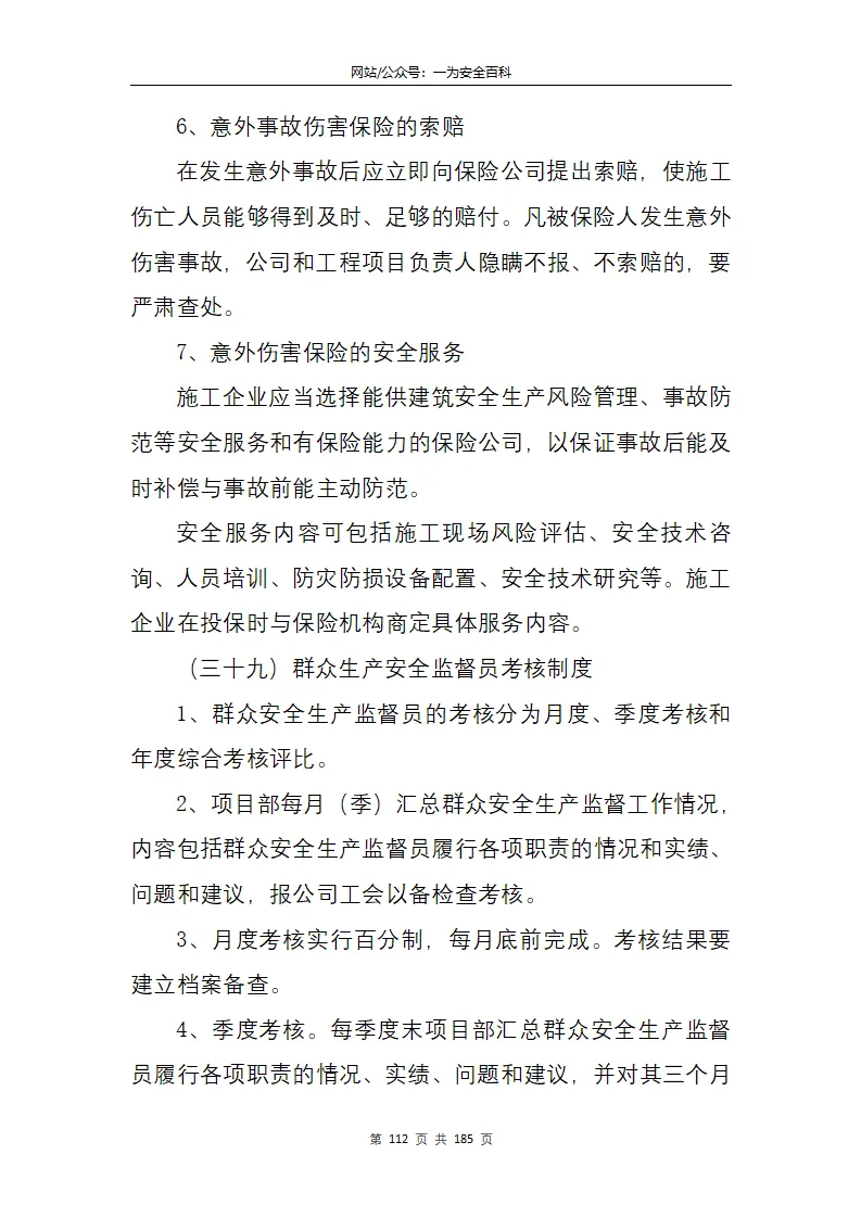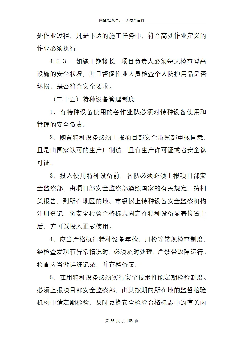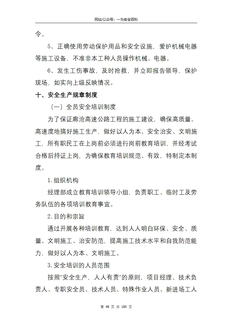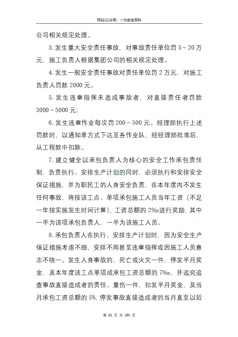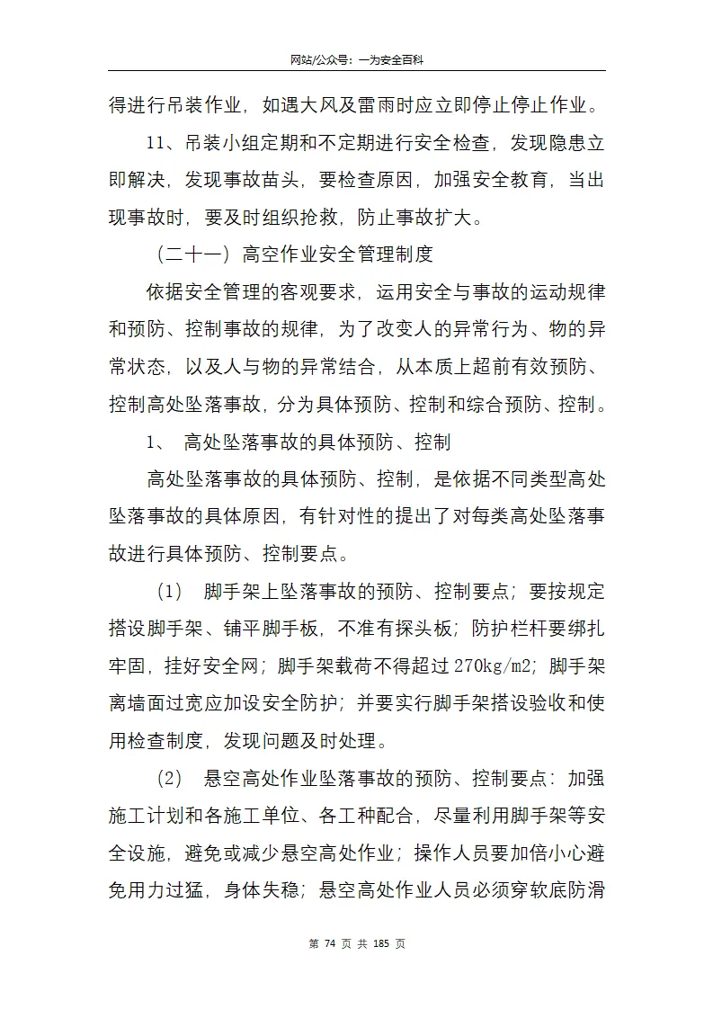建立了全套管理制度,包括全员培训、会议制度、各类检查制度(日常、定期、专项、季节)、隐患排查整改、事故报告与调查处理、奖惩制度、安全技术交底、特种作业持证上岗、安全防护用品管理、消防责任、危险源监控、应急预案演练及意外伤害保险等近四十项制度。