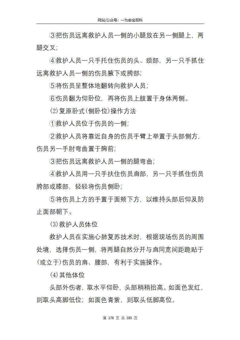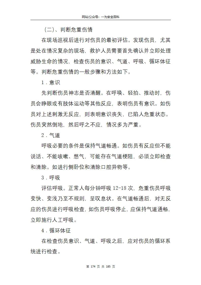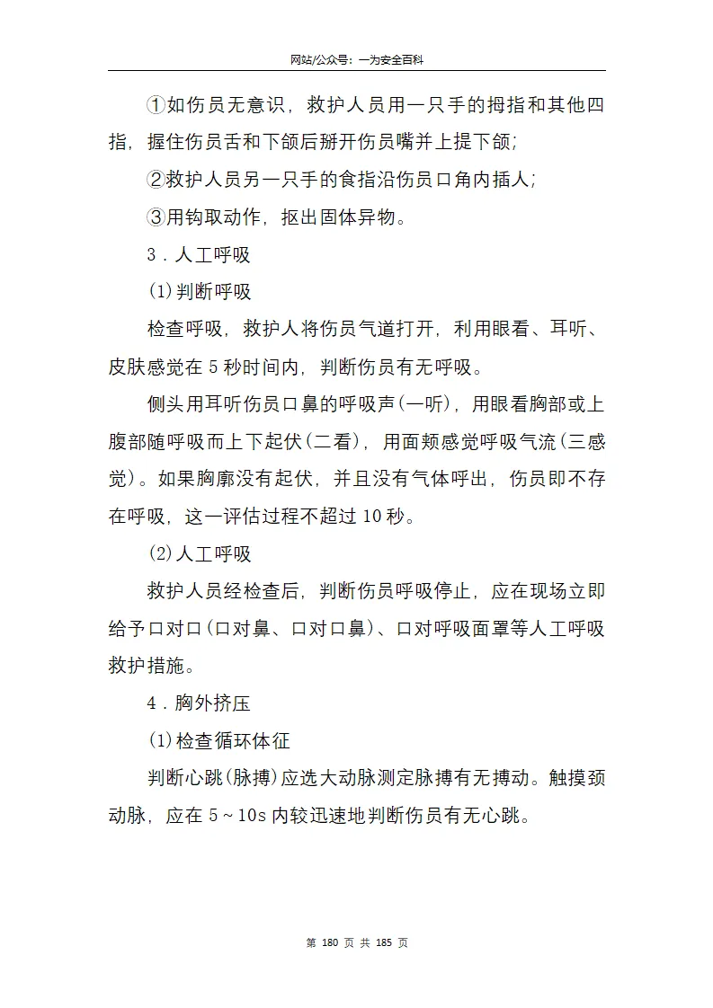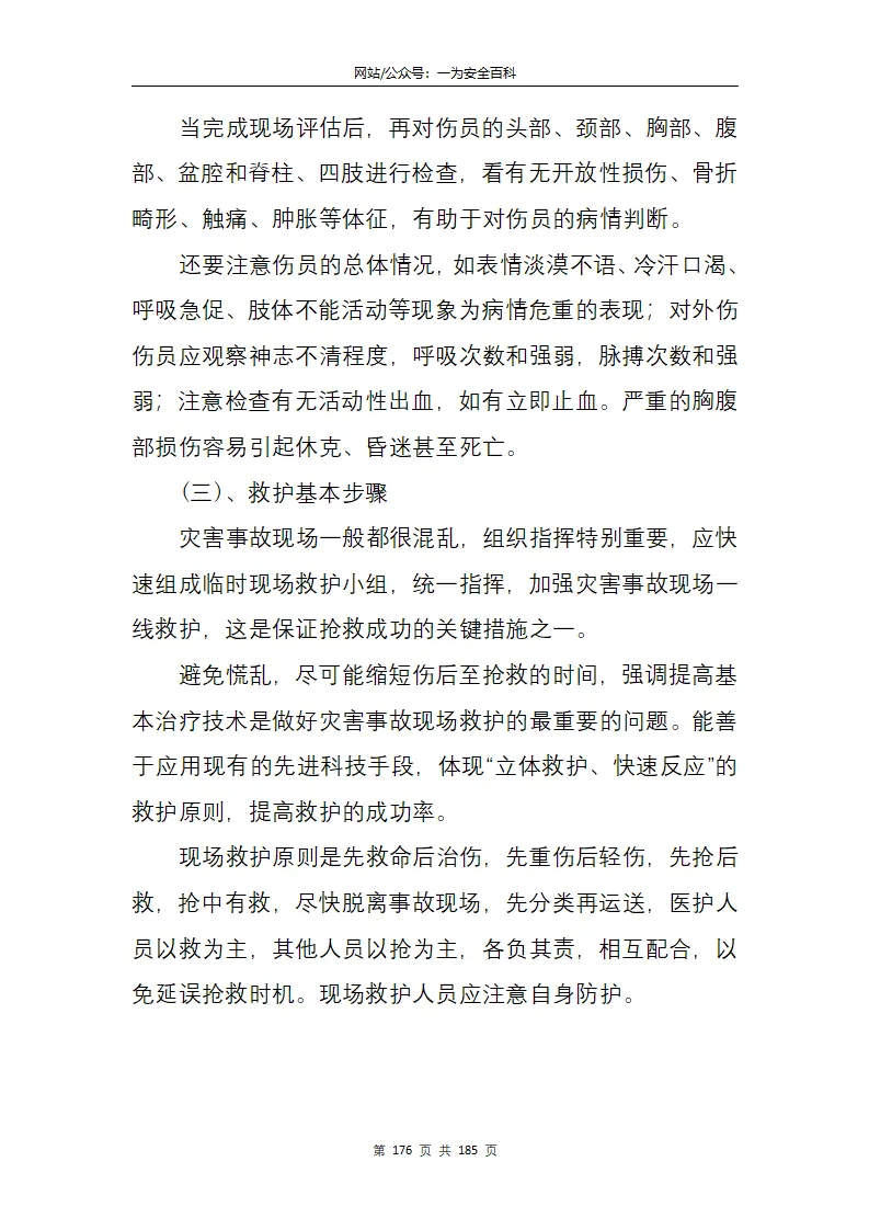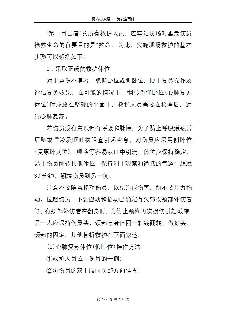 系统讲解了灾害事故现场的救护知识,包括紧急呼救、伤情判断(意识、气道、呼吸、循环)、心肺复苏体位、人工呼吸、胸外按压及止血包扎等基本步骤。