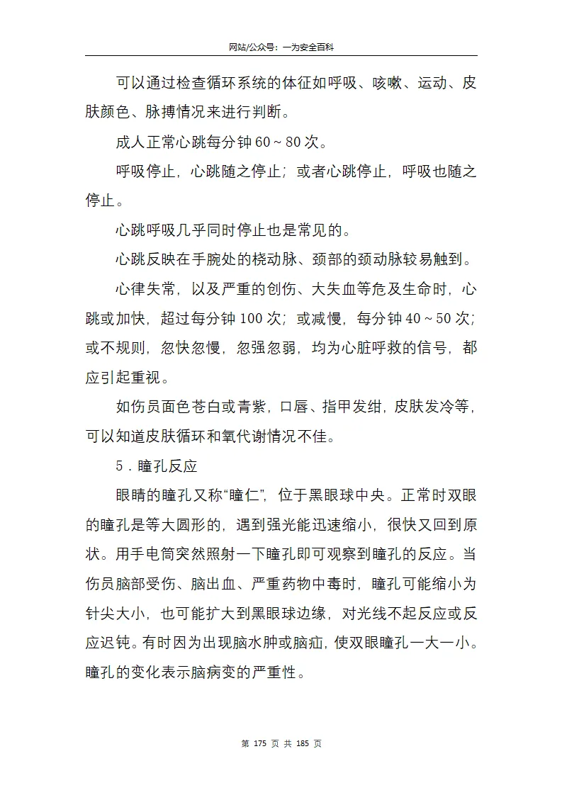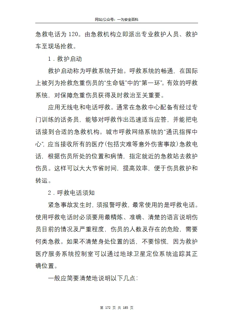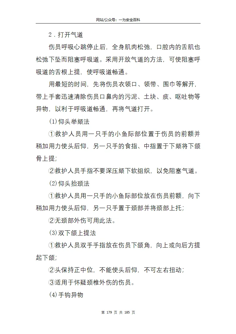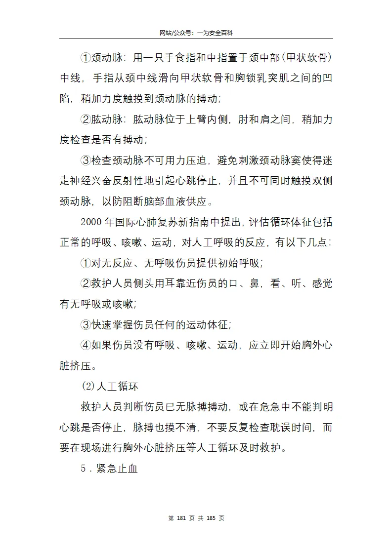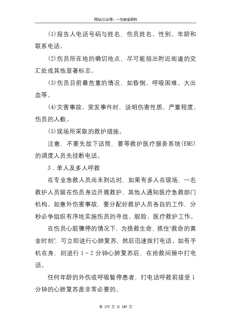 系统讲解了灾害事故现场的救护知识,包括紧急呼救、伤情判断(意识、气道、呼吸、循环)、心肺复苏体位、人工呼吸、胸外按压及止血包扎等基本步骤。