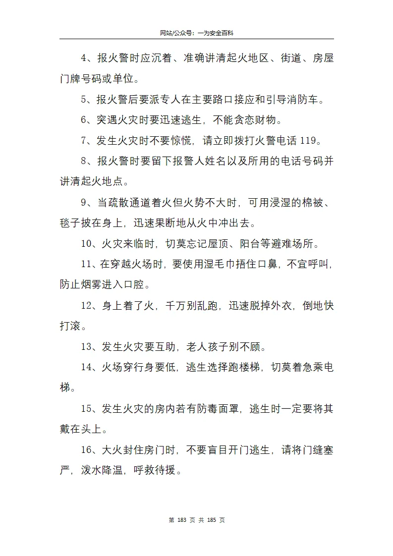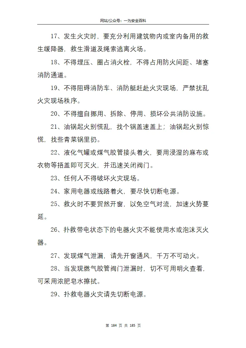 提供了火灾逃生常识(如低姿逃生、湿毛巾捂口鼻、不乘电梯等)和触电急救法(迅速断电、心肺复苏)。