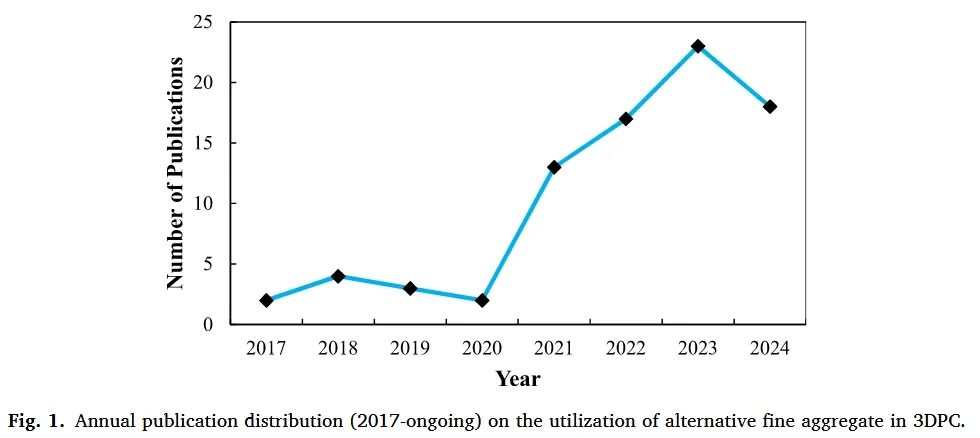 与此同时,工业、矿业和建筑拆除产生的大量废弃物如果处理不当,会造成严重的环境污染。因此,寻找可持续的替代细骨料(AFA)来部分或全部取代3DPC中的天然砂,不仅能降低建筑成本、减少碳足迹,还能实现废弃物的资源化利用。本综述旨在系统评估不同来源的替代细骨料对3D打印混凝土性能的影响,为未来绿色建筑材料的开发提供指导。