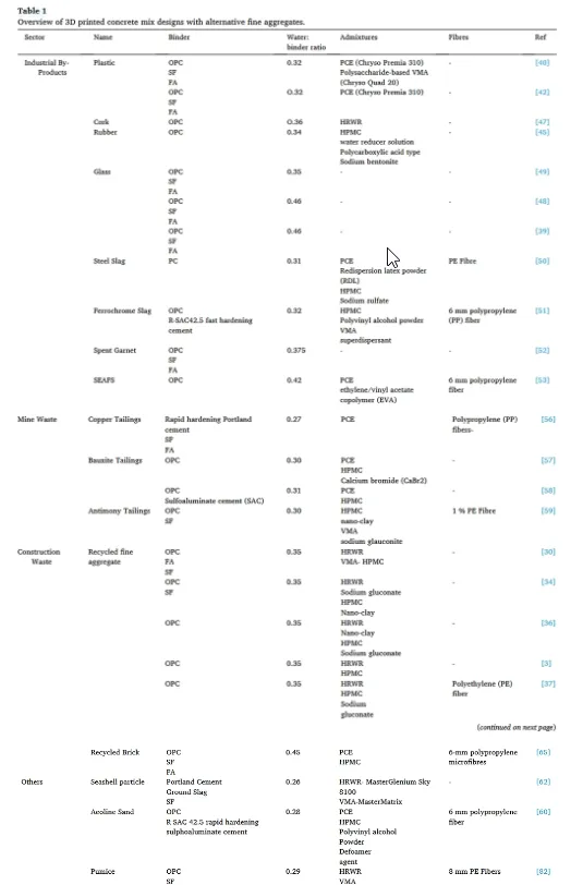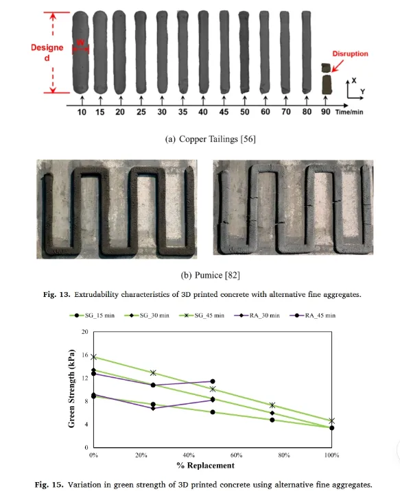 多种废弃物作为替代细骨料在3D打印混凝土中是完全可行的。通过合理的配比设计,可以获得满足打印要求(挤压性和堆叠性)且具有足够强度的绿色混凝土。 - 性能权衡