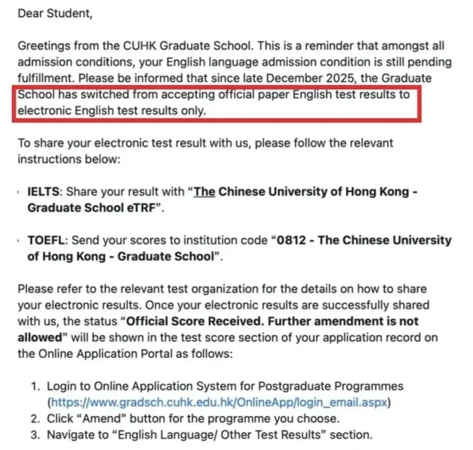 香港中文大学雅思政策更新:接受电子版英语成绩单