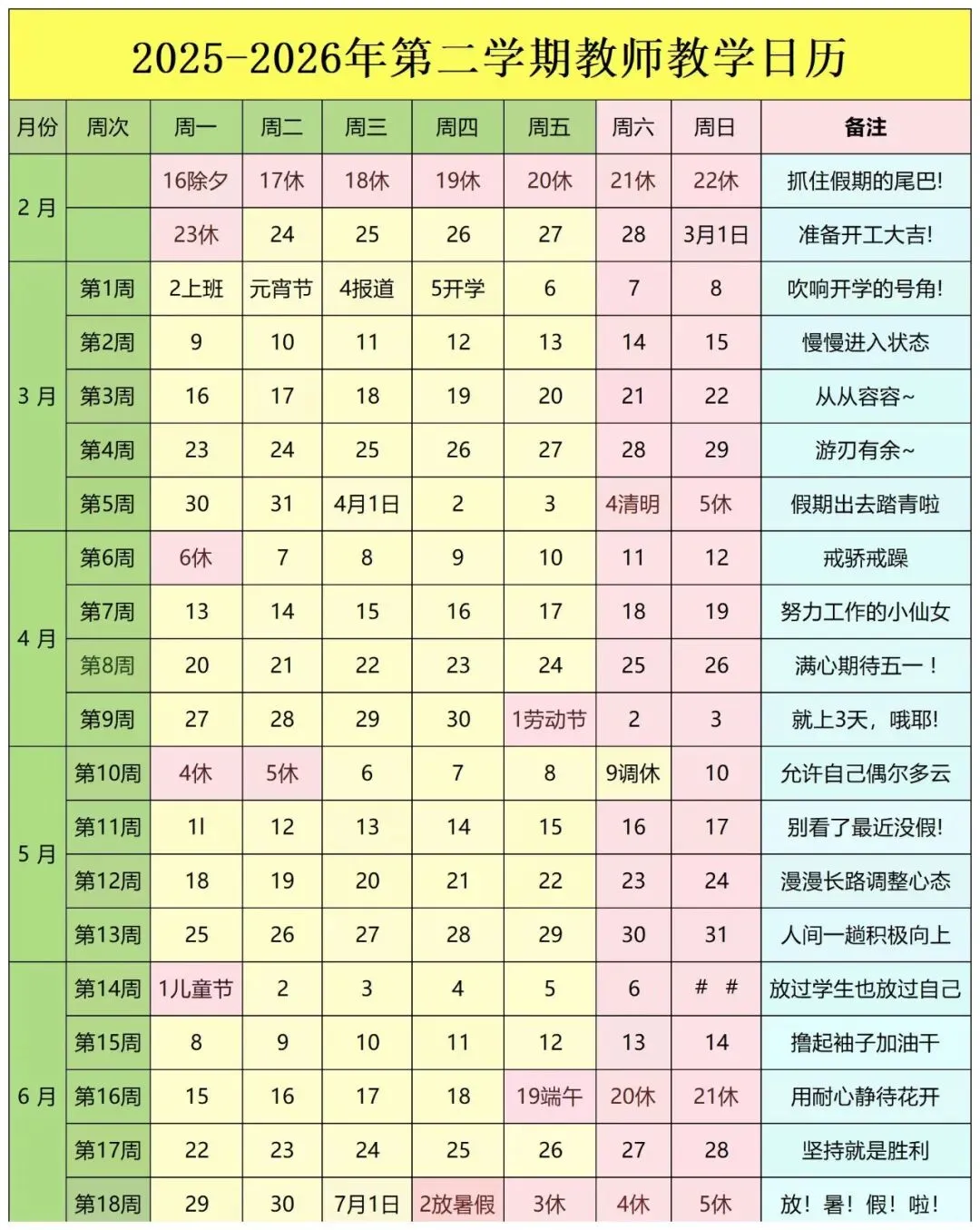 2026 春中小学教师教学日历表电子版免费下载,设计精美,可直接使用