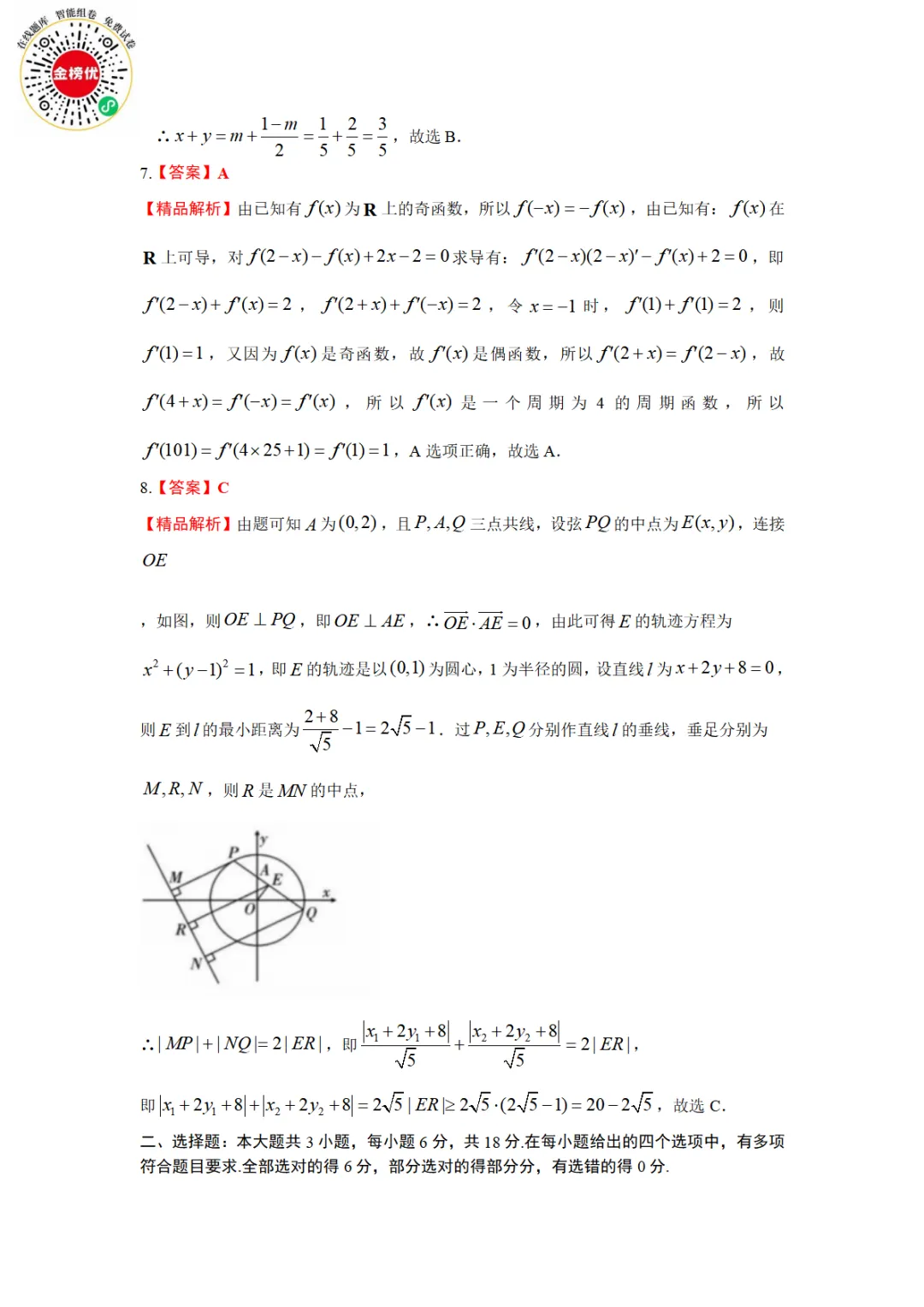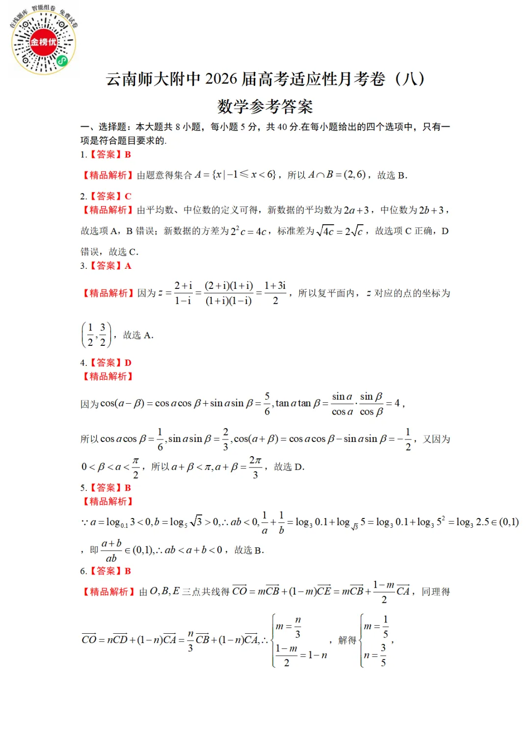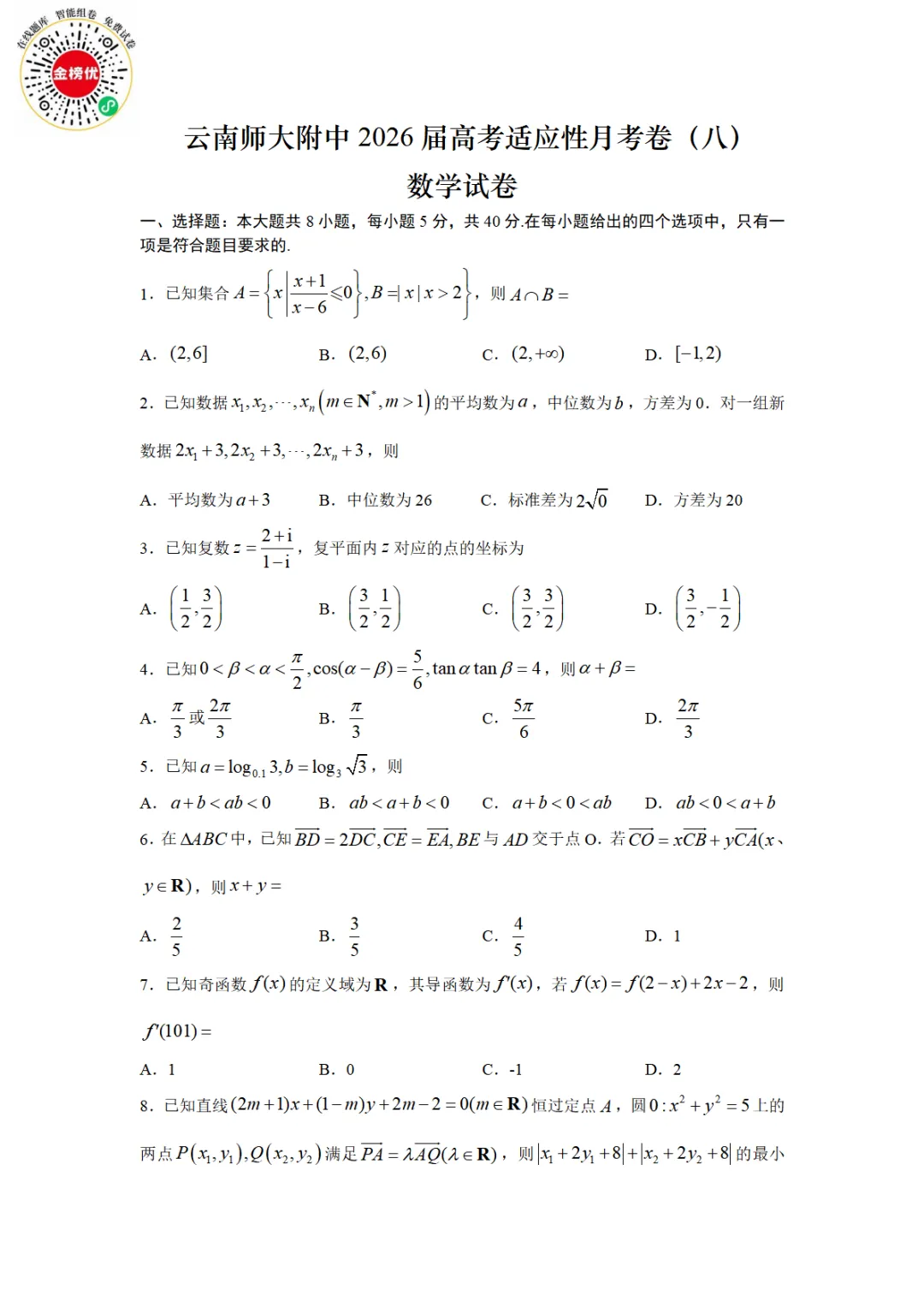 【精品word版】云南师大附中2026届高考适应性月考卷(八)数学试题+答案