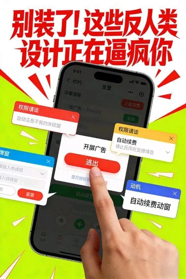 打开手机,本想安安静静用个工具、看个内容、办个小事,结果被APP轮番“折磨”:广告挡路、权限漫天要、会员套路深、操作反人类……