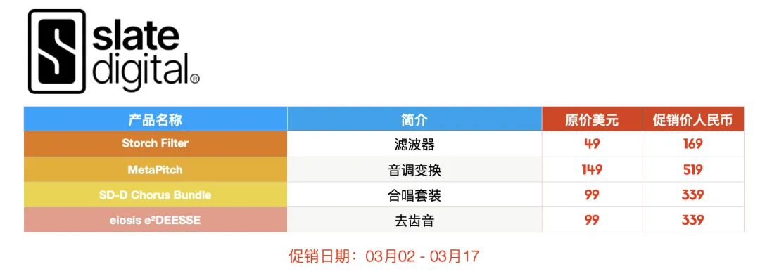 Slate Digital 板岩 四款插件打五折!分别是 Storch Filter/MetaPitch/Chorus D Bundle/eiosis e²DEESSE
