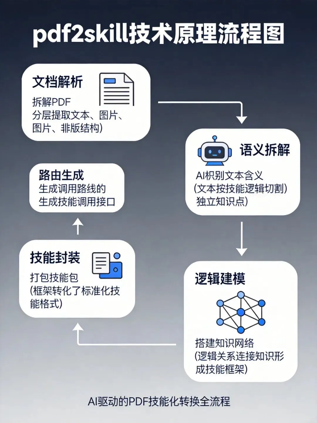 图注:pdf2skill五大核心模块:文档解析→语义拆解→逻辑建模→技能封装→路由生成