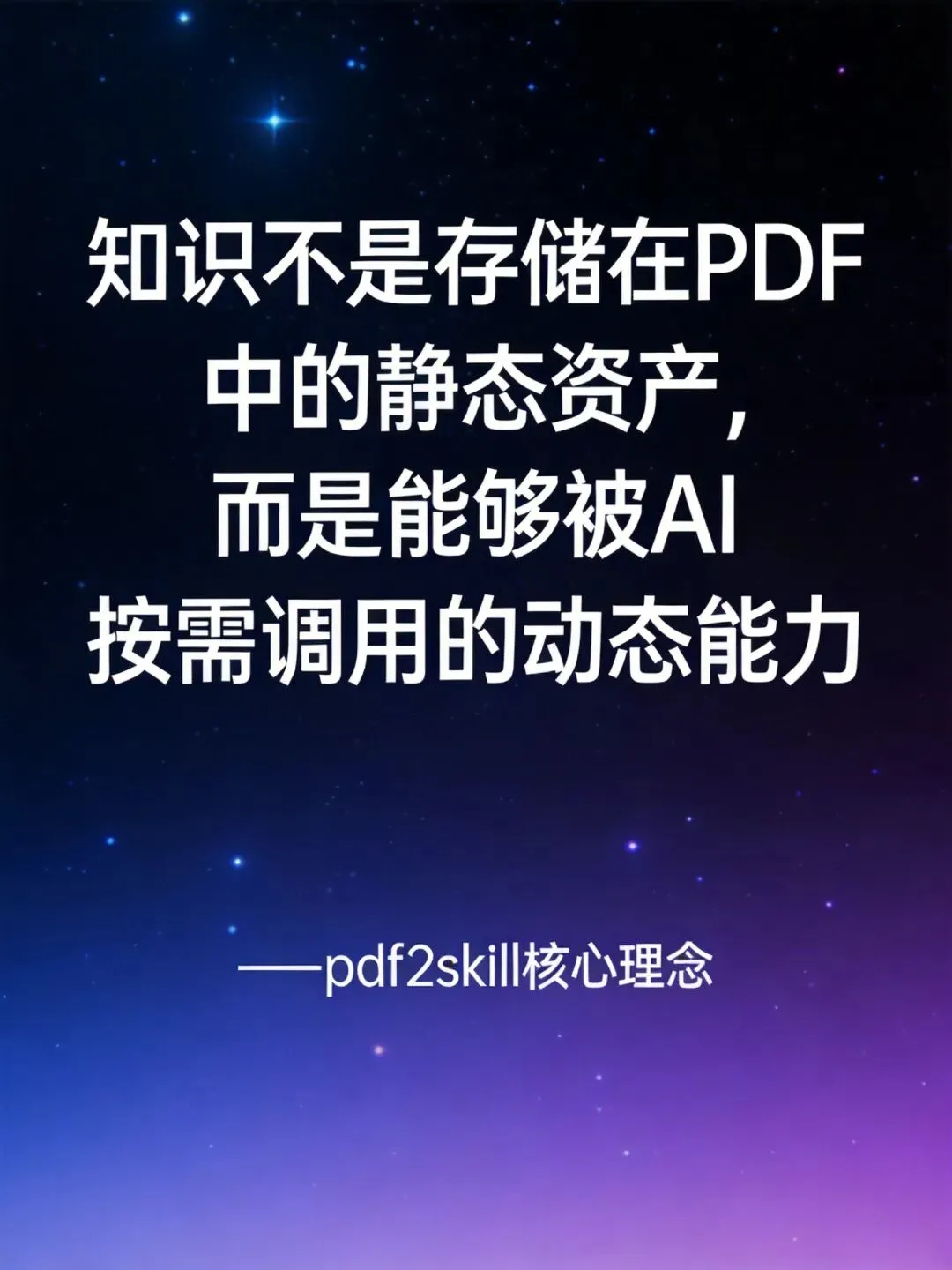 图注:知识不是存储在PDF中的静态资产,而是能够被AI按需调用的动态能力 —— pdf2skill核心理念