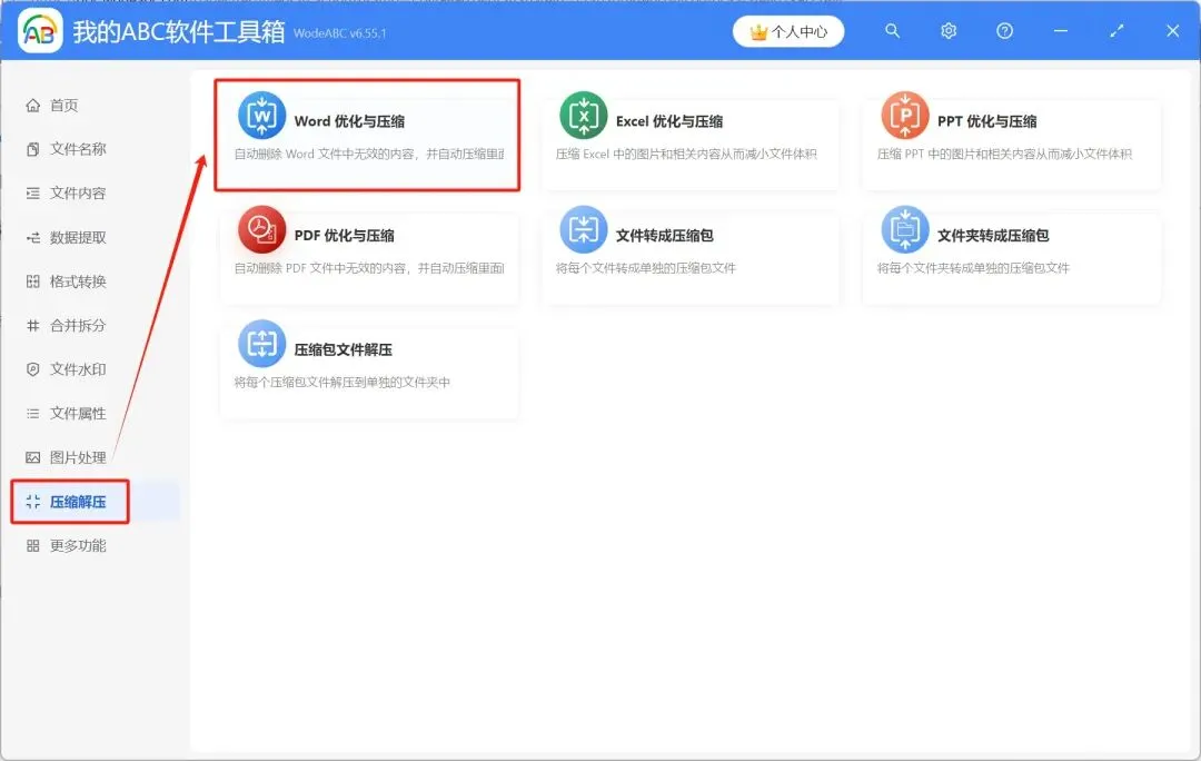 1.打开【我的ABC软件工具箱】,依次选择【压缩解压】-【Word优化与压缩】。