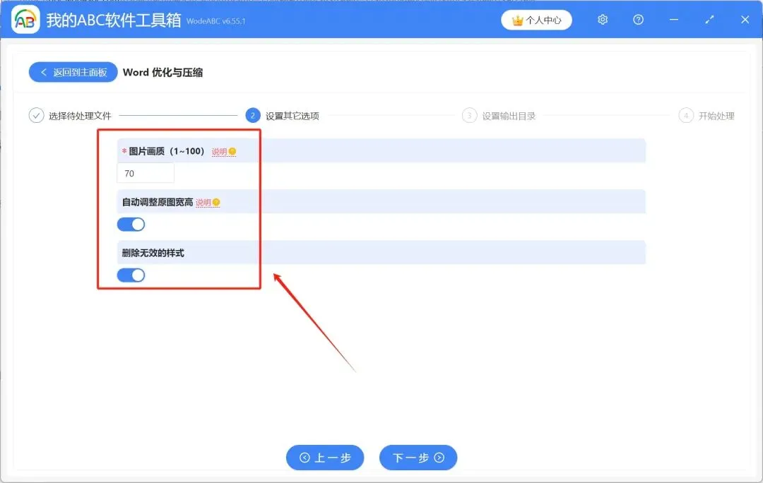 3.填写图片画质,一般情况下调整为70%即可,设置过高时,看不出什么差别,设置过低则会导致图片很模糊并且充满色块。自动调整原图宽高、删除无效的样式,根据实际情况选择即可。