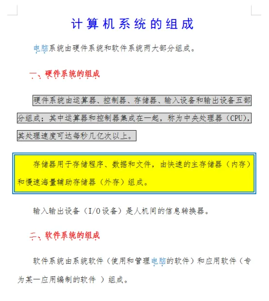 5)设置正文第二段“硬件系统的组成”和第六段“软件系统的组成”字体颜色红色、加粗,并添加“一、二、”编号和着重号。(此操作可以使用格式刷,作用:用于复制选中文本的字符格式和段落格式。单击格式刷,可以复制一次;双击格式刷,可以复制多次,复制完成后按ESC键退出格式刷复制状态。)