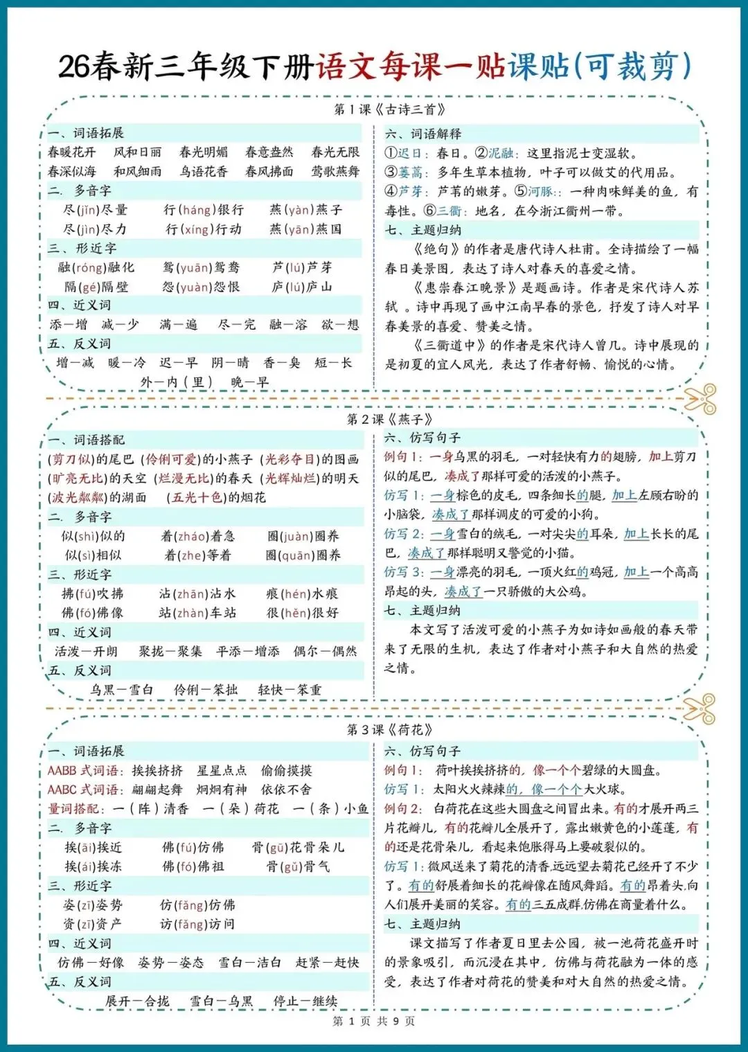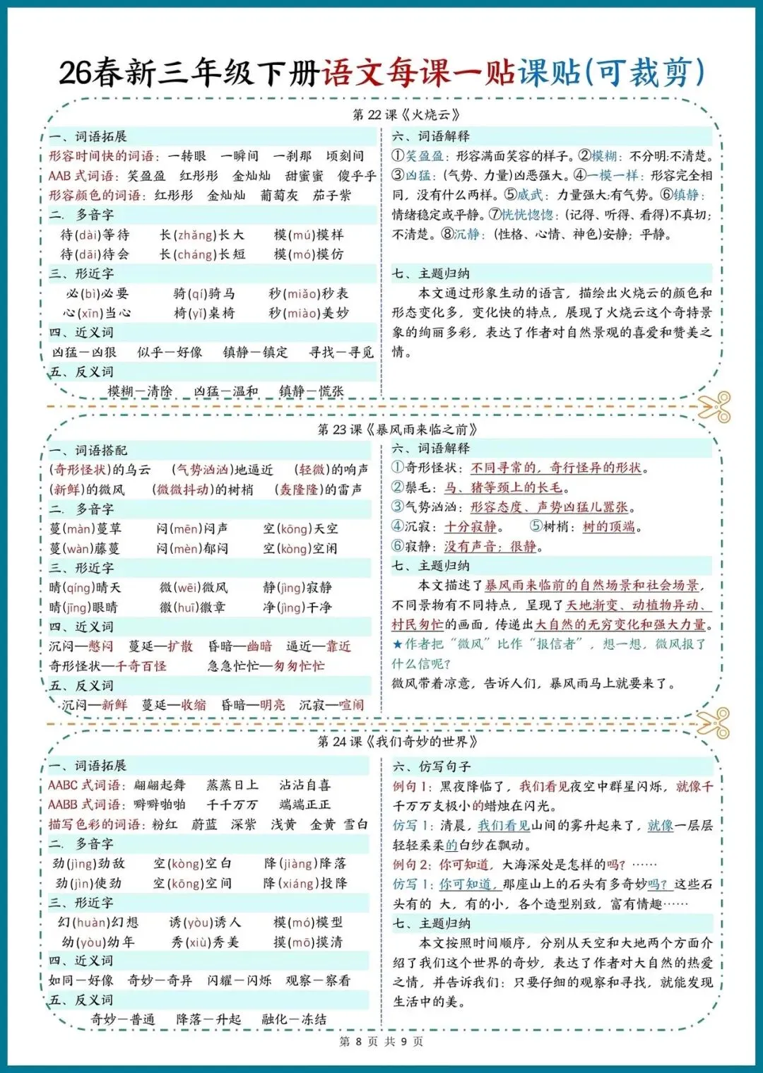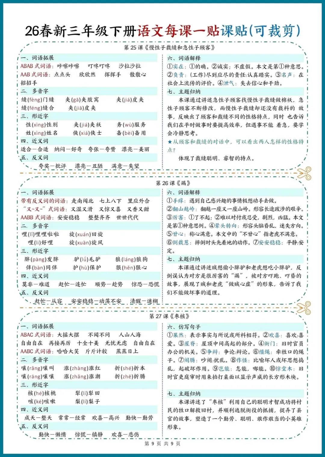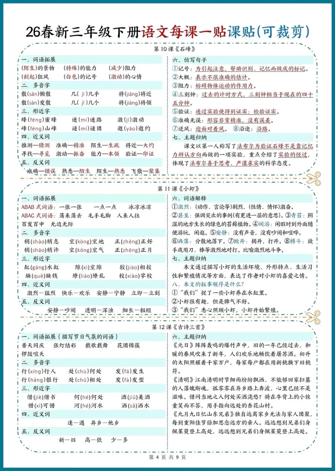 📚 26春新三年级下册语文|每课一贴,可裁剪随身记!把重点知识装进口袋,预习复习超省心!