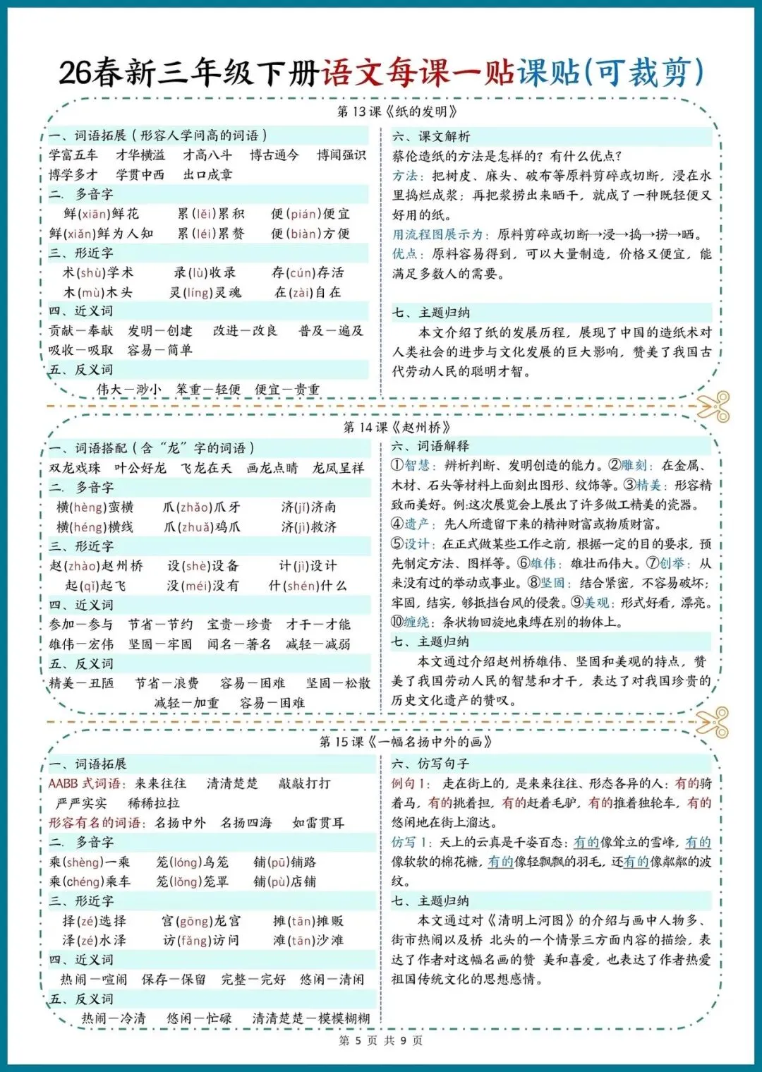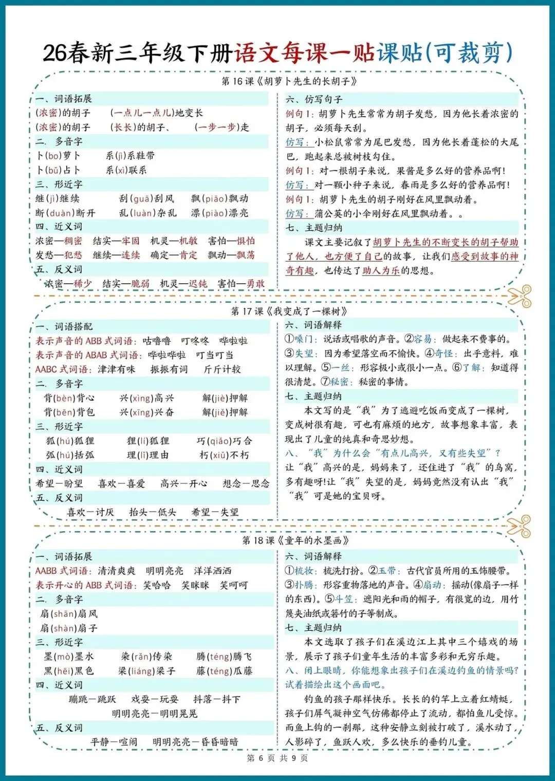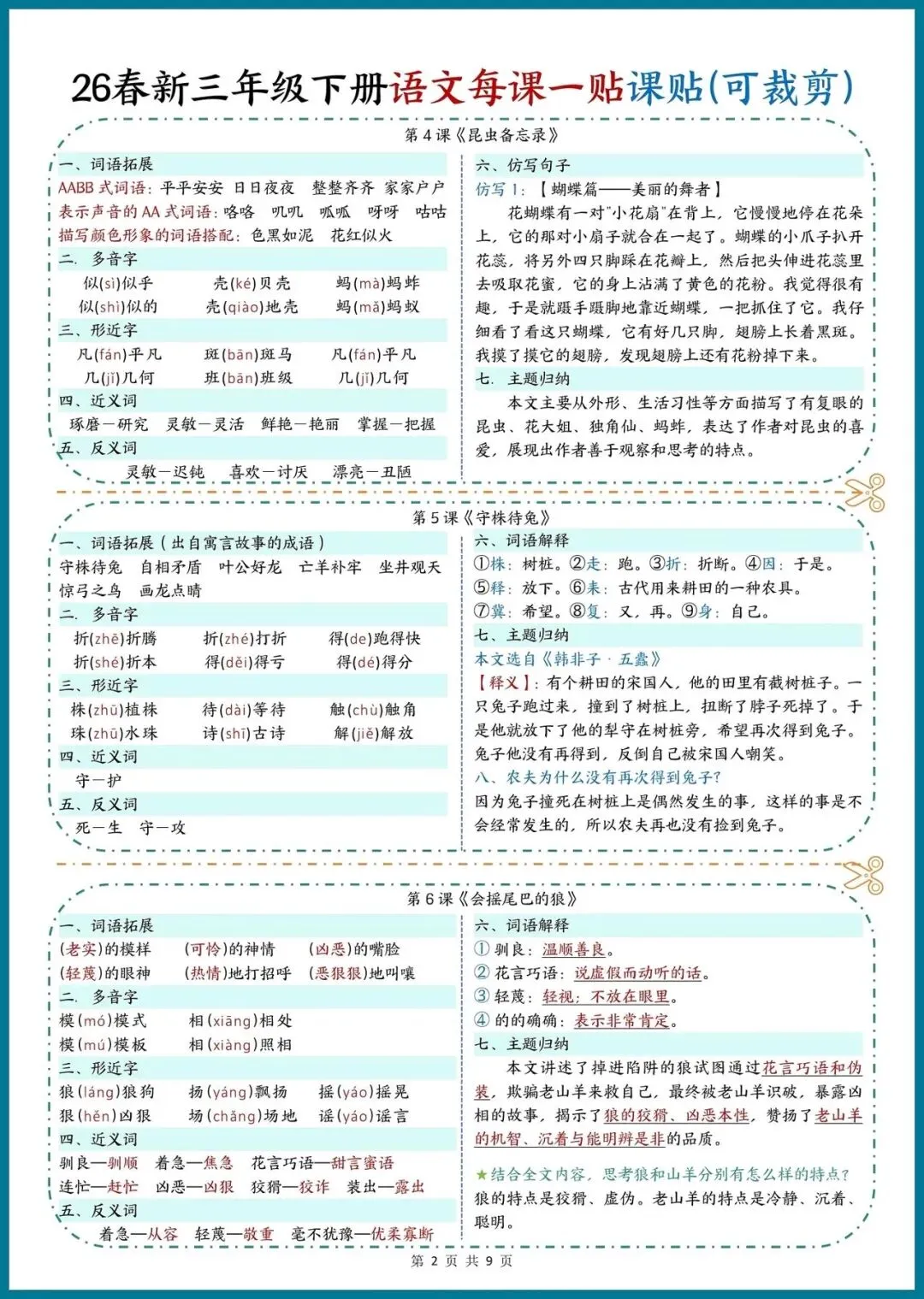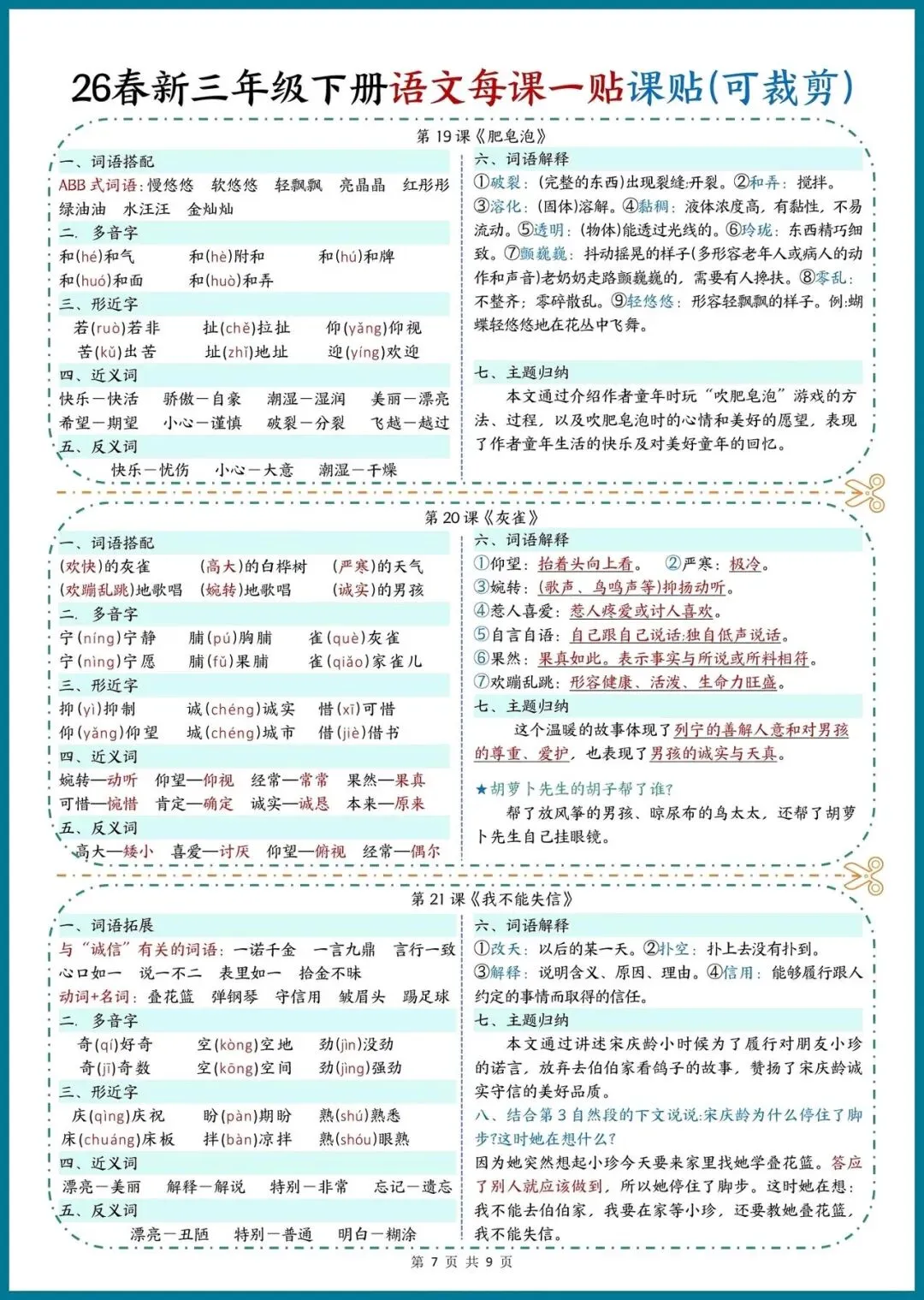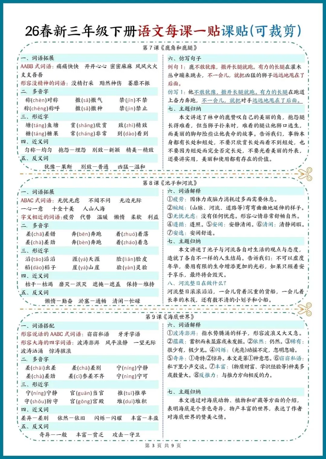 📚 26春新三年级下册语文|每课一贴,可裁剪随身记!把重点知识装进口袋,预习复习超省心!