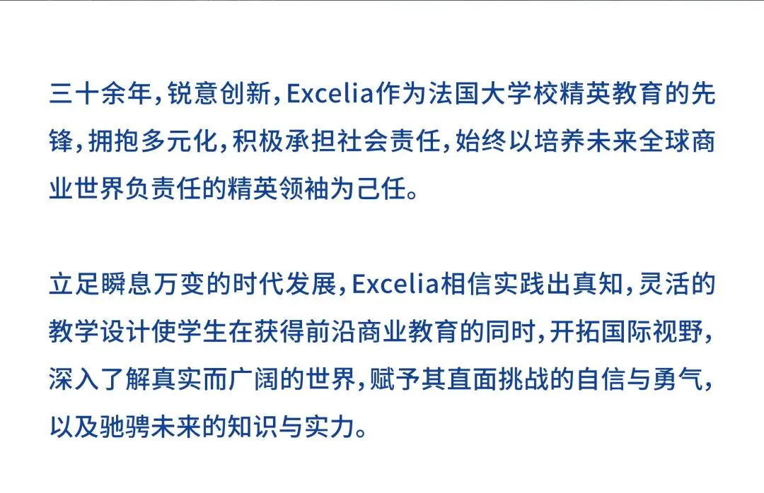 Excelia商学院(Excelia Group)由原拉罗谢尔商学院发展而来,现已成为在法国拥有四大校区(拉罗谢尔、图尔、奥尔良、巴黎-卡尚)的高等教育集团。学院以创新化、个性化教学为特色,注重人文关怀与实践体验的深度融合。作为少数荣获EQUIS、AACSB和AMBA三重国际认证的商学院,Excelia所有课程均支持工学结合模式,并与全球约200所高校建立合作关系。