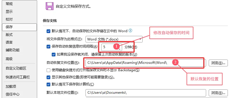 针对习惯3,具体操作流程为:点击【文件】→【选项】→【保存】,将【保存自动恢复信息时间间隔】设定为x分钟,并勾选【若未保存便关闭,则保留上次自动保存的版本】选项。此处,时间间隔越短,自动保存操作的频率就越高。当Word文档容量较大时,频繁的自动保存操作可能会致使在使用Word过程中出现运行卡顿现象。