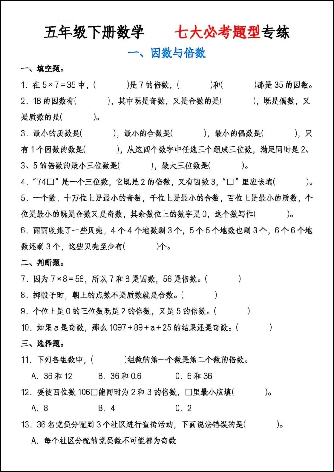😉 今天分享26年五年级下册数学《七大必考专项》,共35页,可提供电子版方便下载打印。这份资料为五年级学生提供了全面的数学题型练习,通过多样化的题型和知识点,帮助学生巩固和提升数学基础知识和解题能力。