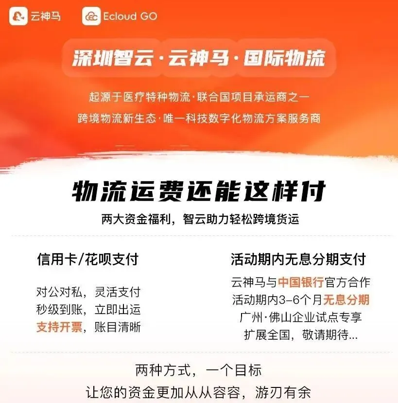 智云物流联合中国银行,正式推出物流运费分期服务。针对符合条件的订单,您可以选择3-6个月分期付款,活动期内更可享受低至无息的专项优惠。
