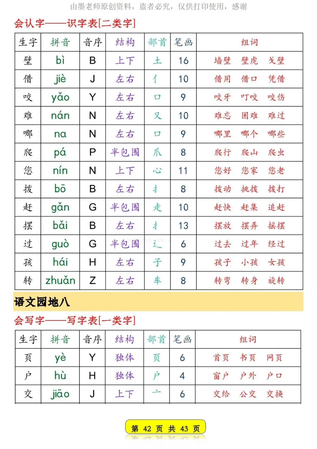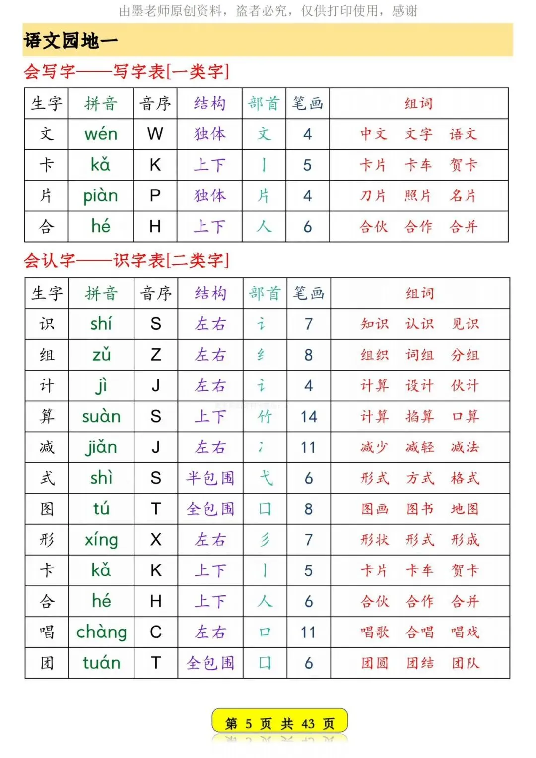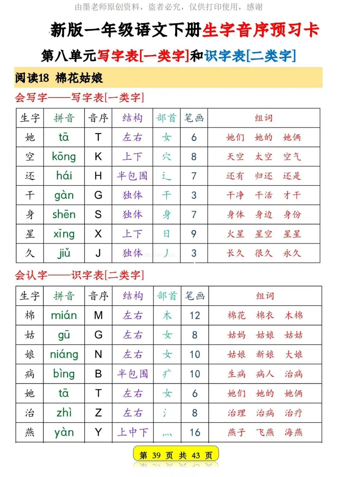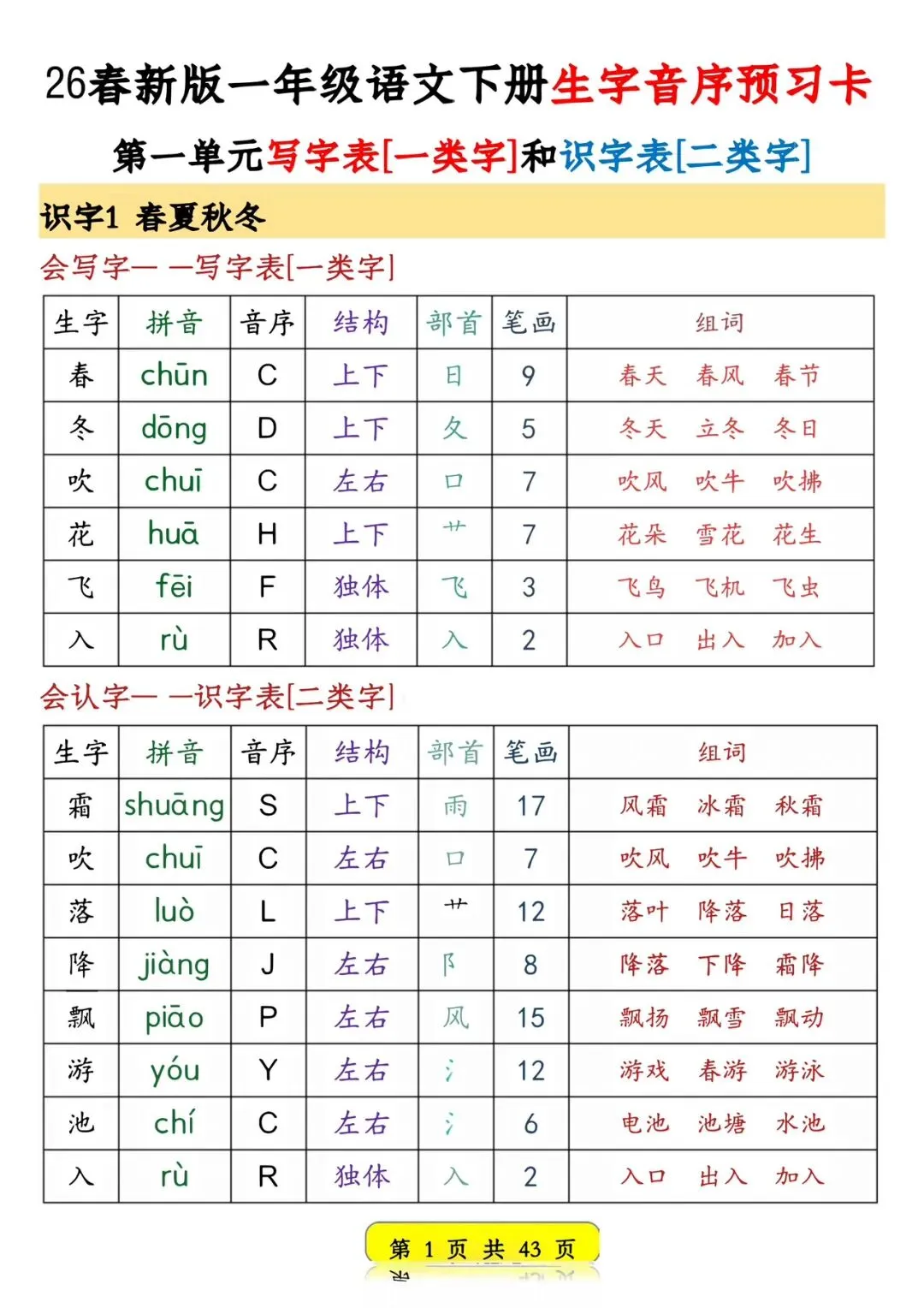 26春新版一年级语文下册生字音序预习卡【可打印】
