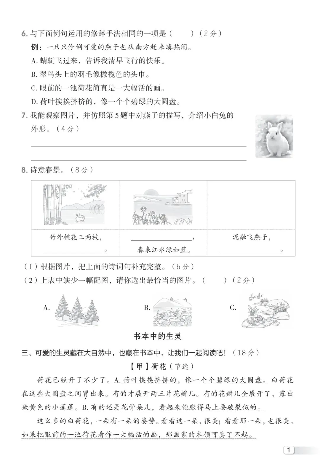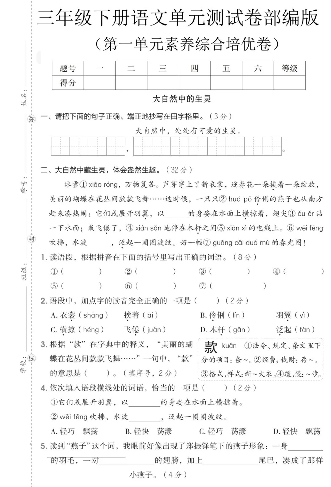 26年春新版三年级下册语文部编版第一单元素养综合培优卷,有完整可打印