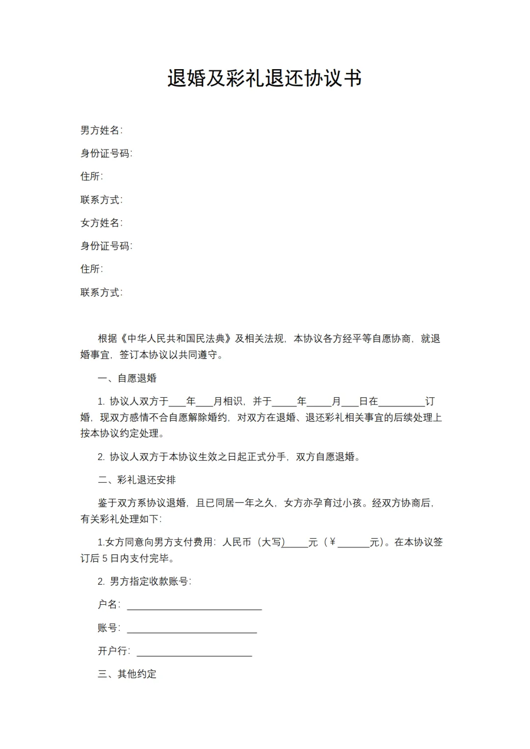 退婚及彩礼退还协议书模板,WORD文档电子版,可免费下载打印