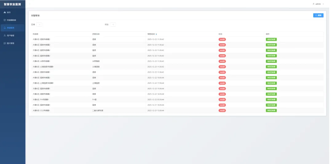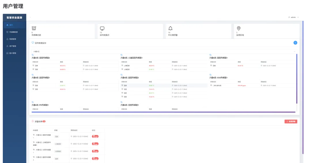 智慧农业数据监测系统是一个用于实时监测和管理农业传感器数据的综合性平台。系统通过 MQTT 协议接收传感器数据,提供实时数据监控、历史数据查询、预警管理、用户权限控制等功能。