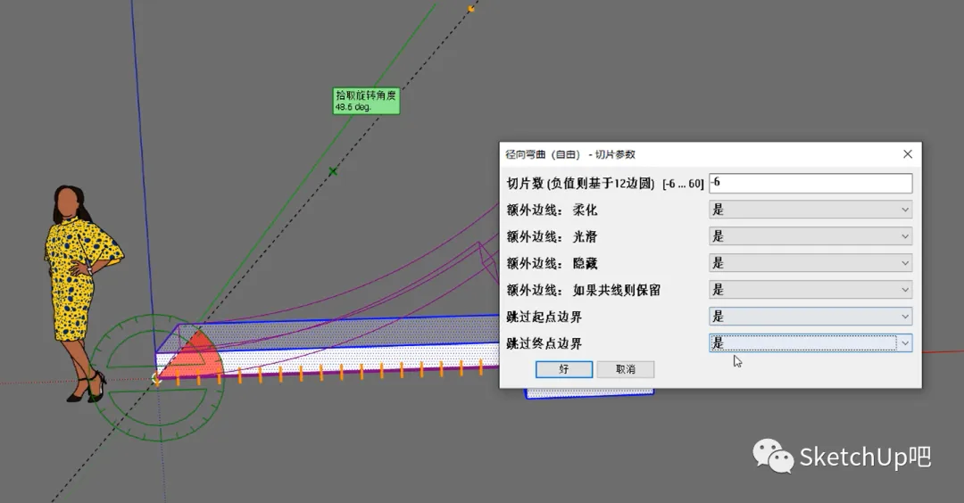 在SUAPP插件库中的自由缩放插件(SUAPP编号431)里,有一个径向自由弯曲功能,他是SketchUp缩放增强工具,通过控制点进行径向弯曲变形。