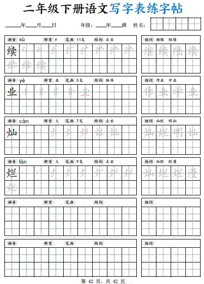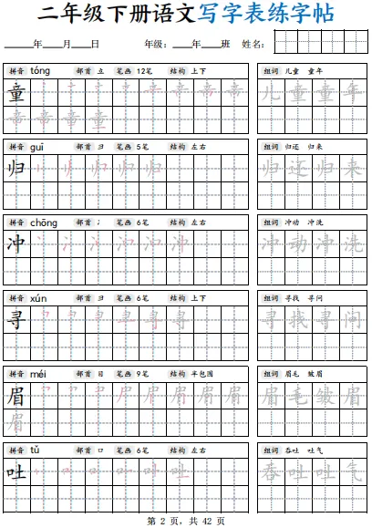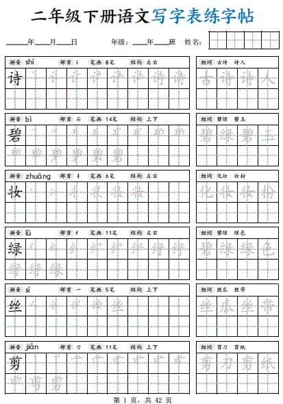 📚🔥二年级下册语文写字表练字帖,42页,电子版可下载可打印,关注我们回复0305即可免费领取,需要的家长抓紧安排,给孩子打印上练一练吧。
