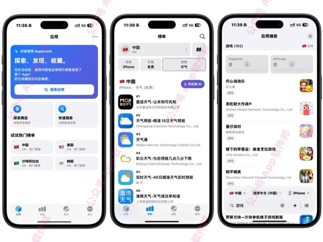 今天分享的是一款能让你把App Store玩出花的应用——Appboard。之前为了关注国外榜单,我得来回切换账号,麻烦得要命。用Appboard后,真的一站式解决了,直接切换国家地区就能看全球排名。最戳我的是追踪功能,我把自己开发的应用和竞品都加进去,每天看排名波动、评分变化,简直不要太爽。内置翻译也很贴心,看日本区应用介绍再也不用复制粘贴去翻译了。我还用文件夹把工具类、设计类的应用分类收藏,方便随时翻看。现在主屏幕放了小组件,热门应用的排名变动一目了然。数据通过iCloud同步,iPad和iPhone上无缝切换。目前这款应用高级完整版正在限免中,记得要下滑才能看到Plus0.00,手慢无。
