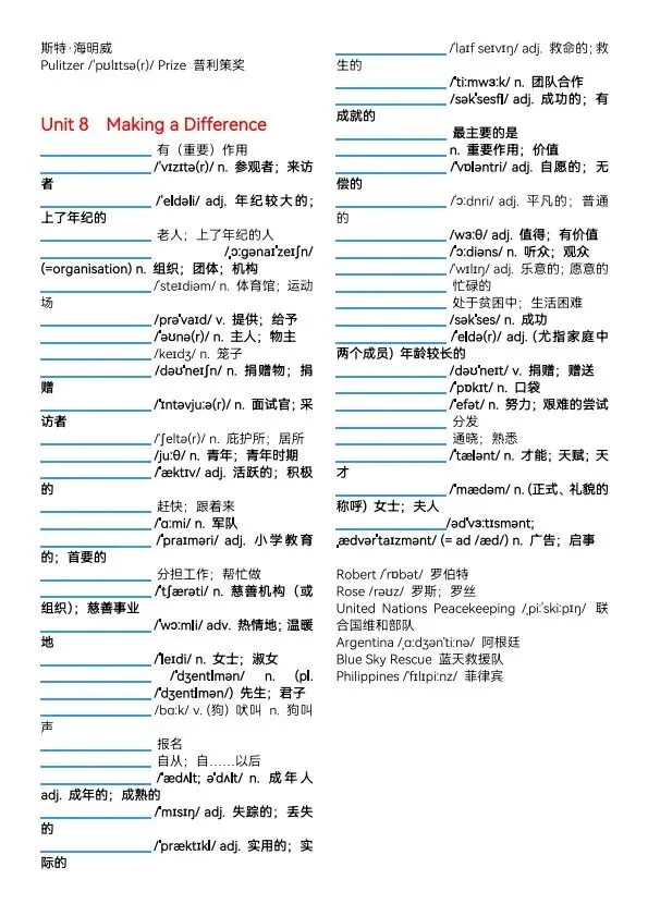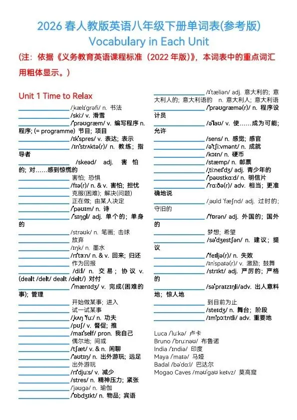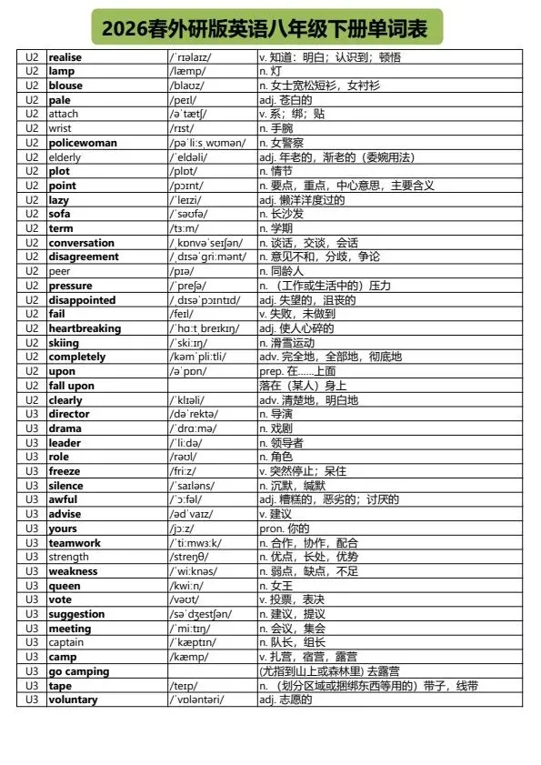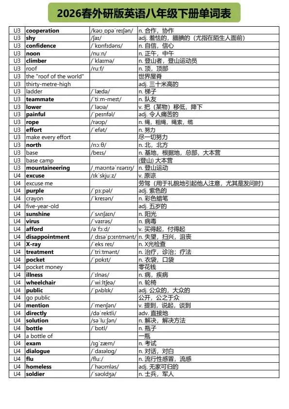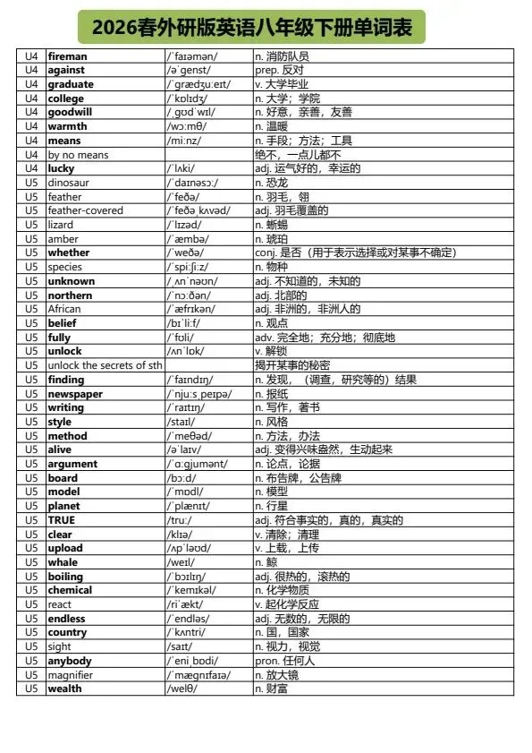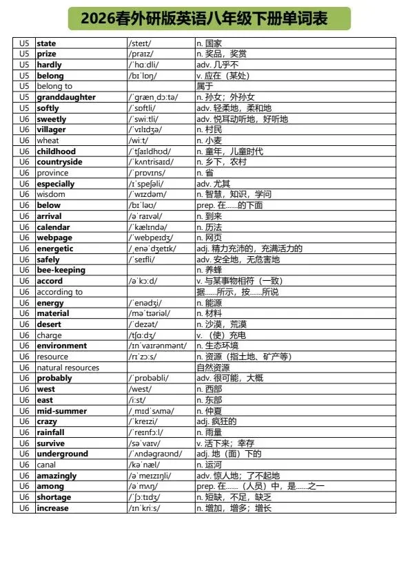 今日分享26春【外研版】八年级下册英语单词表默写(带音标)完整电子版可打印!所有资料均为高清电子版,排版规整适配打印,不用费心整理,直接打印就能用。精准击破学习难点,帮孩子夯实基础、吃透考点,稳步提升学习效率!