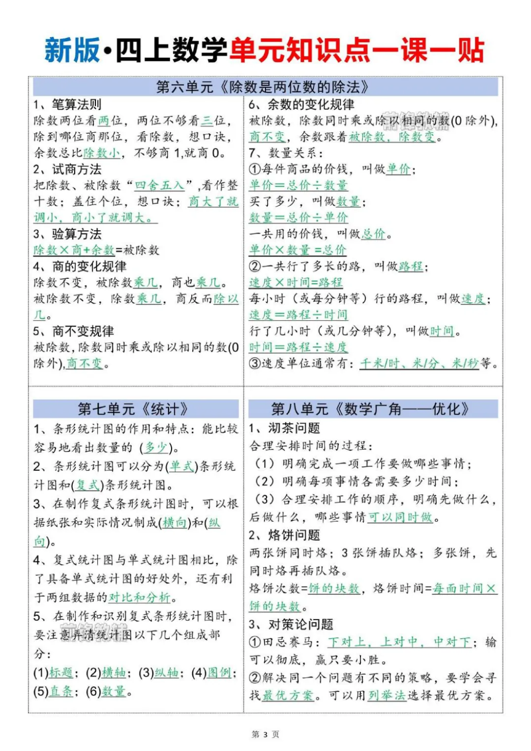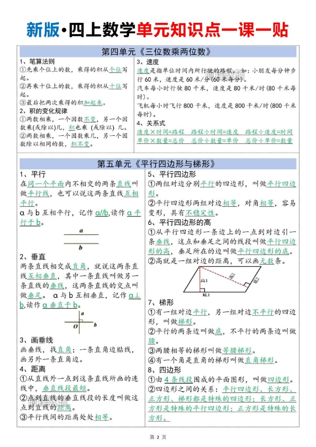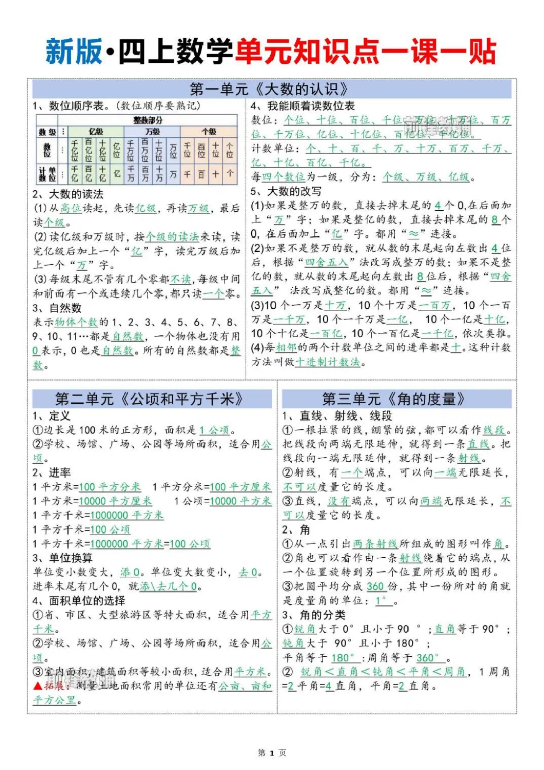 新版四年级上册数学单元知识点一课一贴,电子版可打印