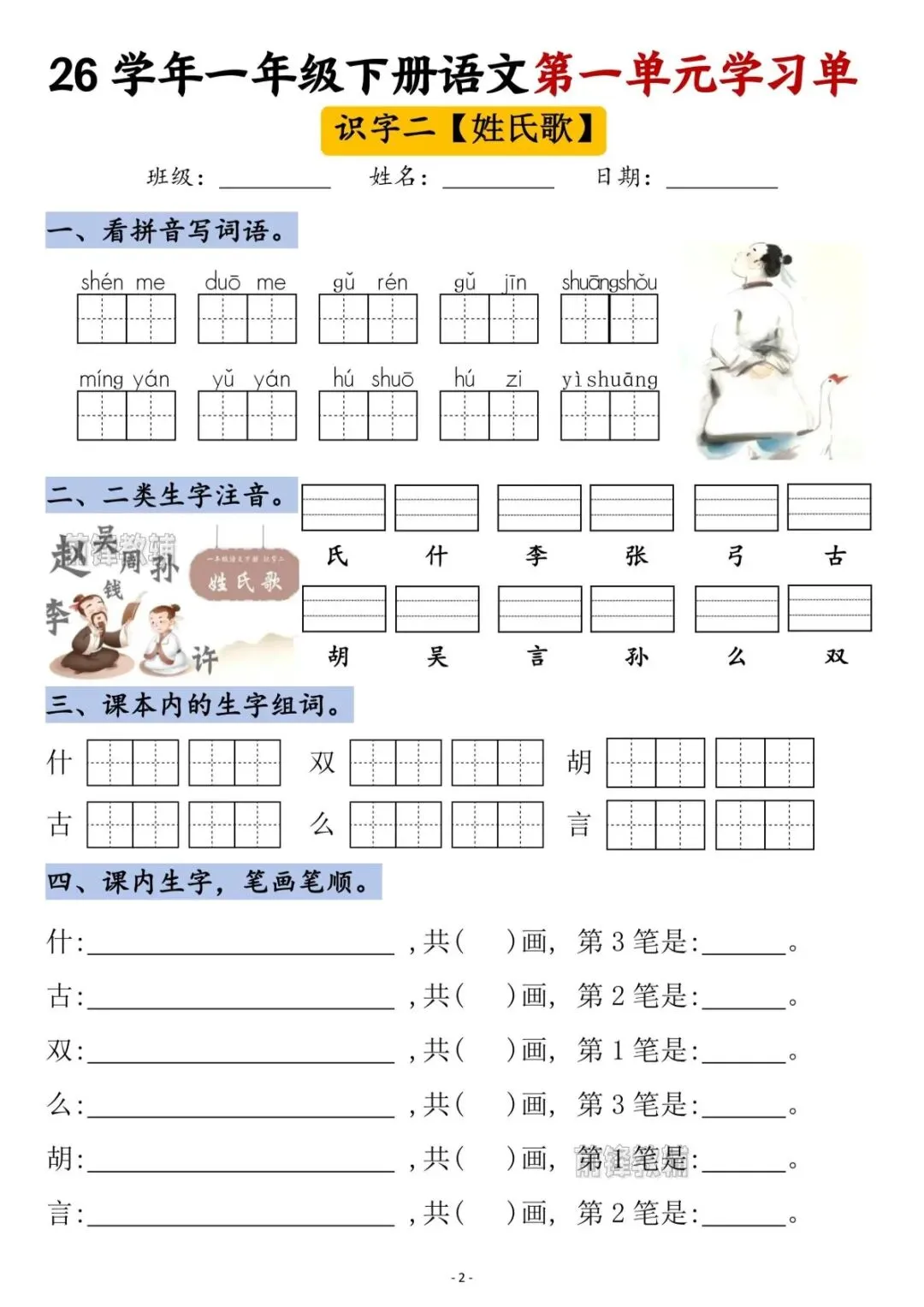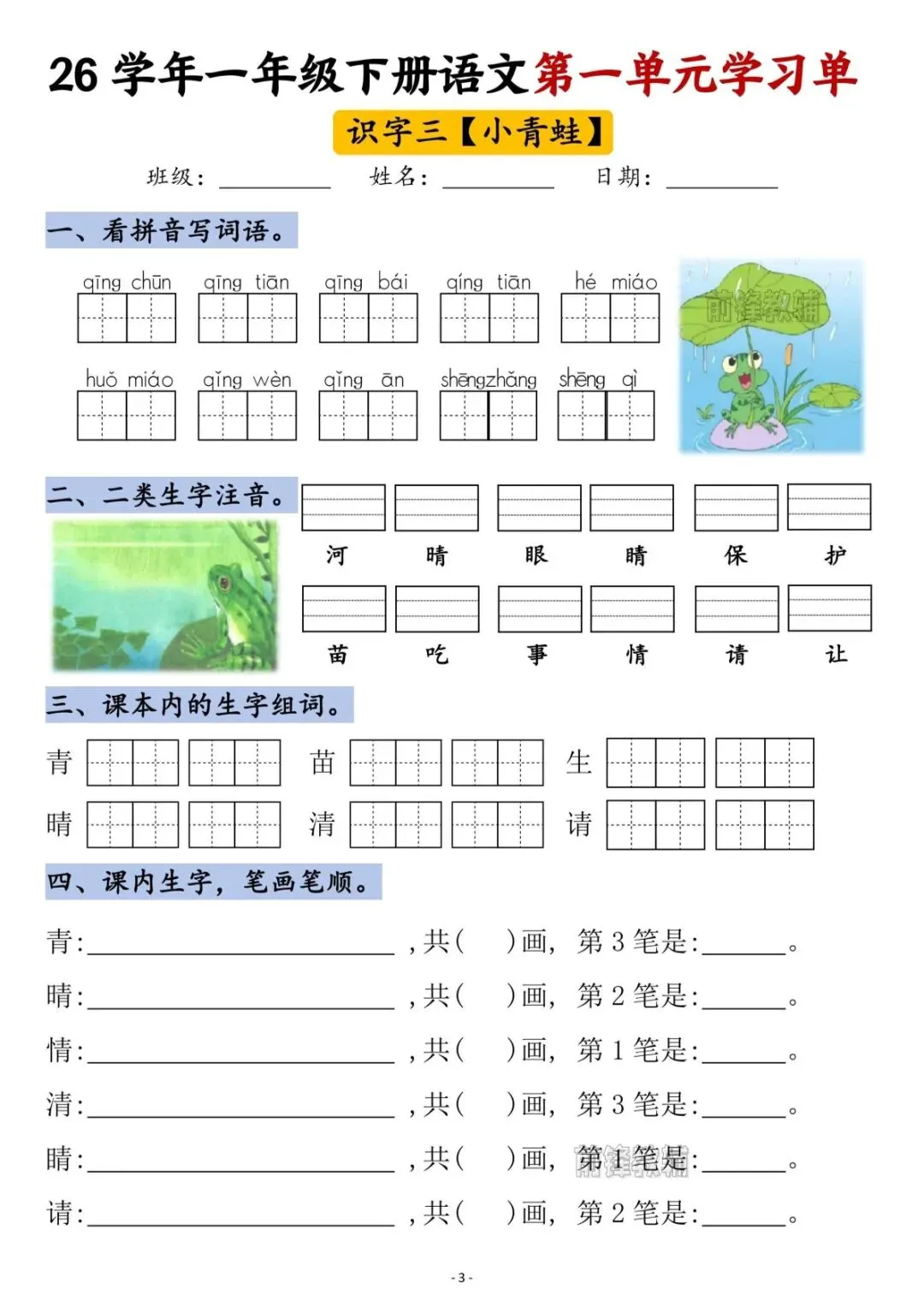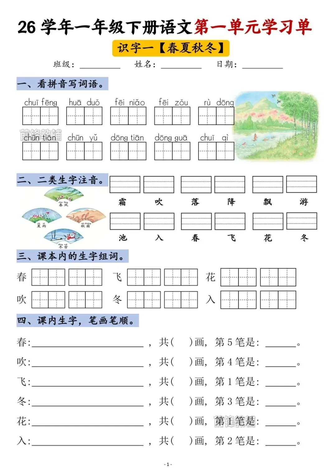 26春一年级下册语文第一单元学习单(电子版可打印)