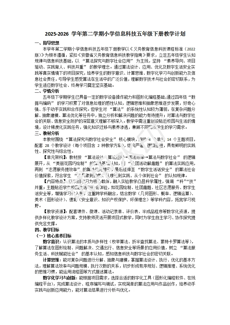 【教学计划】电子工业版五年级信息科技2025-2026第二学年度教学计划
