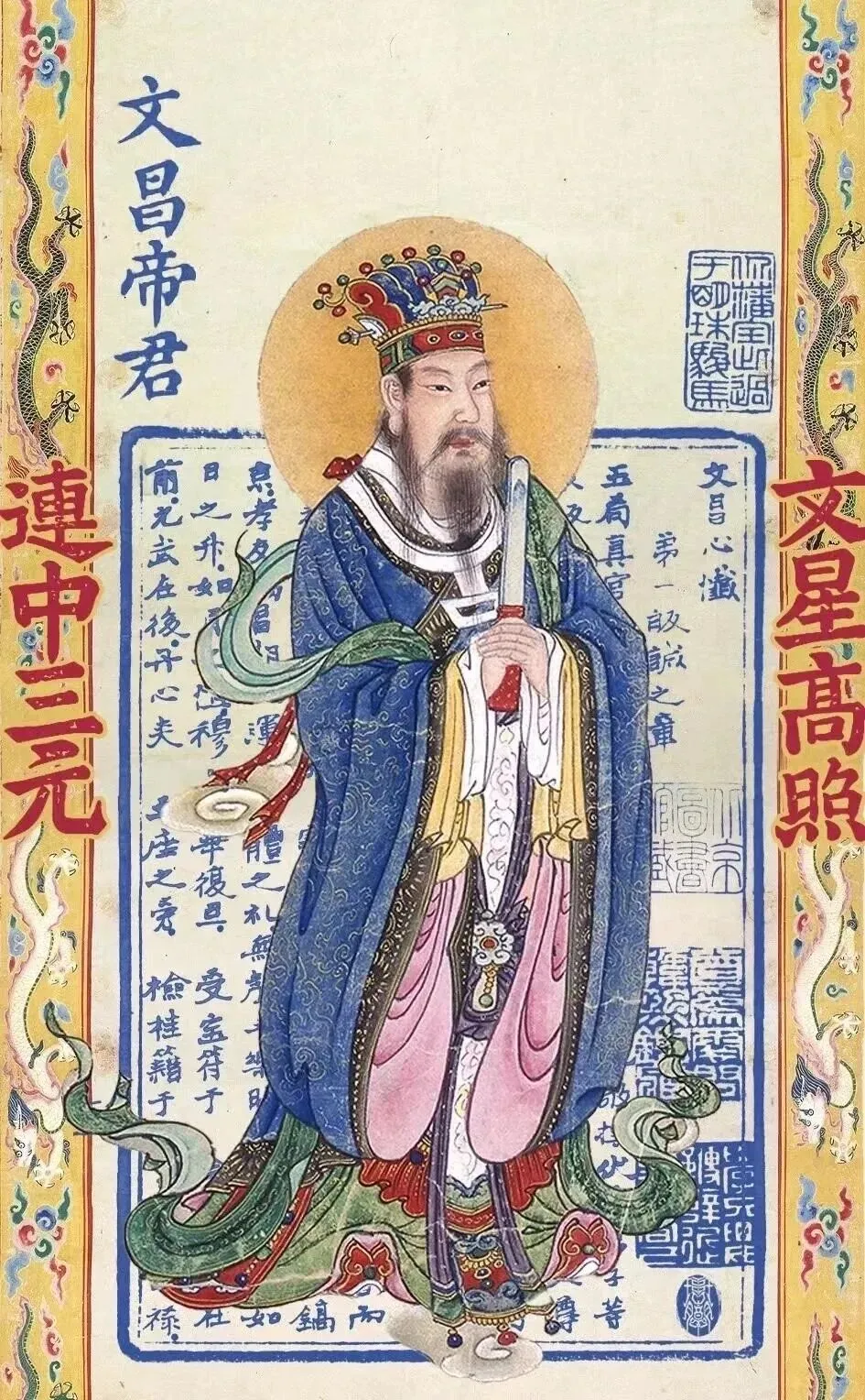 文昌帝君,为道教尊奉的文运之神,专司智慧、文运、功名、学业与仕途,主掌天下文星,护佑学子聪慧开窍、文思泉涌、考试顺遂;职场人士思路清明、事业精进、前程稳进等。
