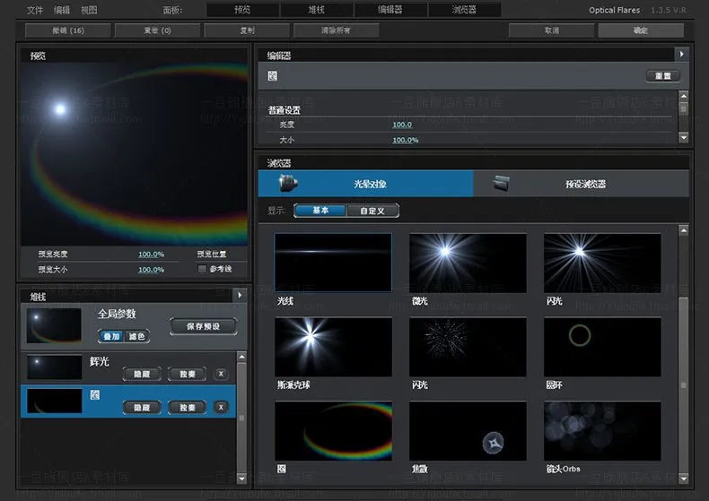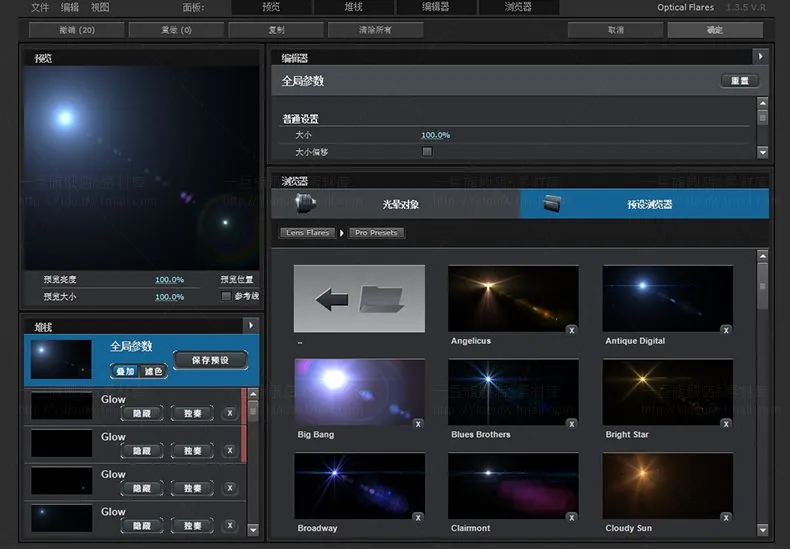 opticalflares的界面操作相比灯光工厂要简单易懂许多,