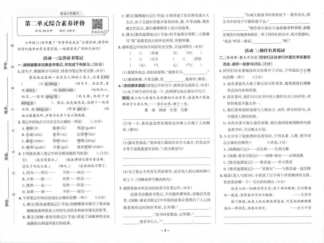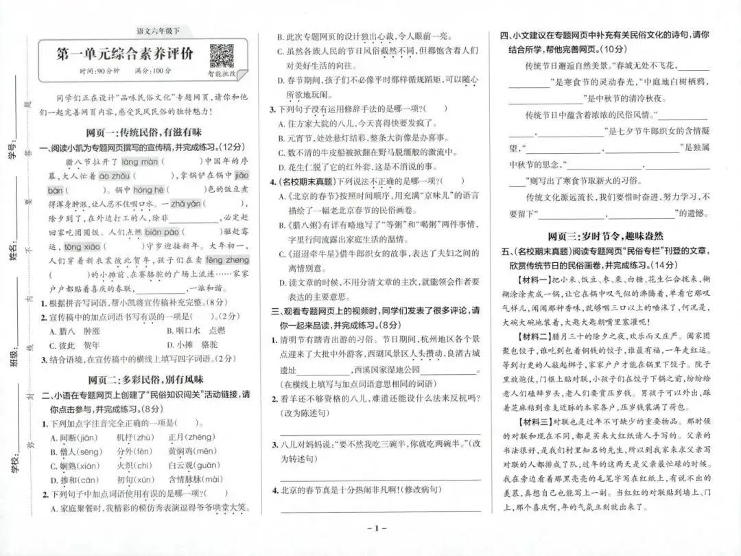26春人教部编版六年级下册语文《综合素养单元卷、期中期末卷》,共24页,含答案,可打印