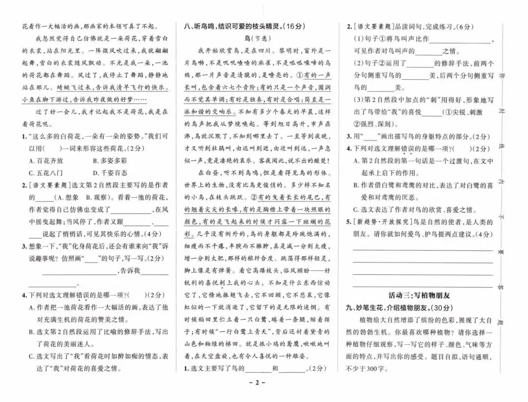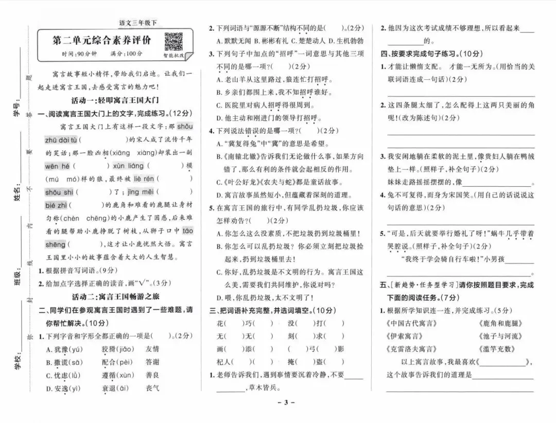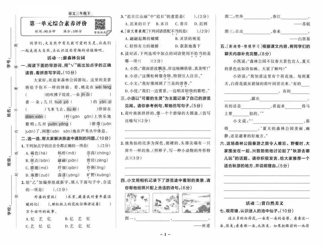 26春人教部编版三年级下册语文《综合素养单元卷、期中期末卷》,共24页,含答案,可打印