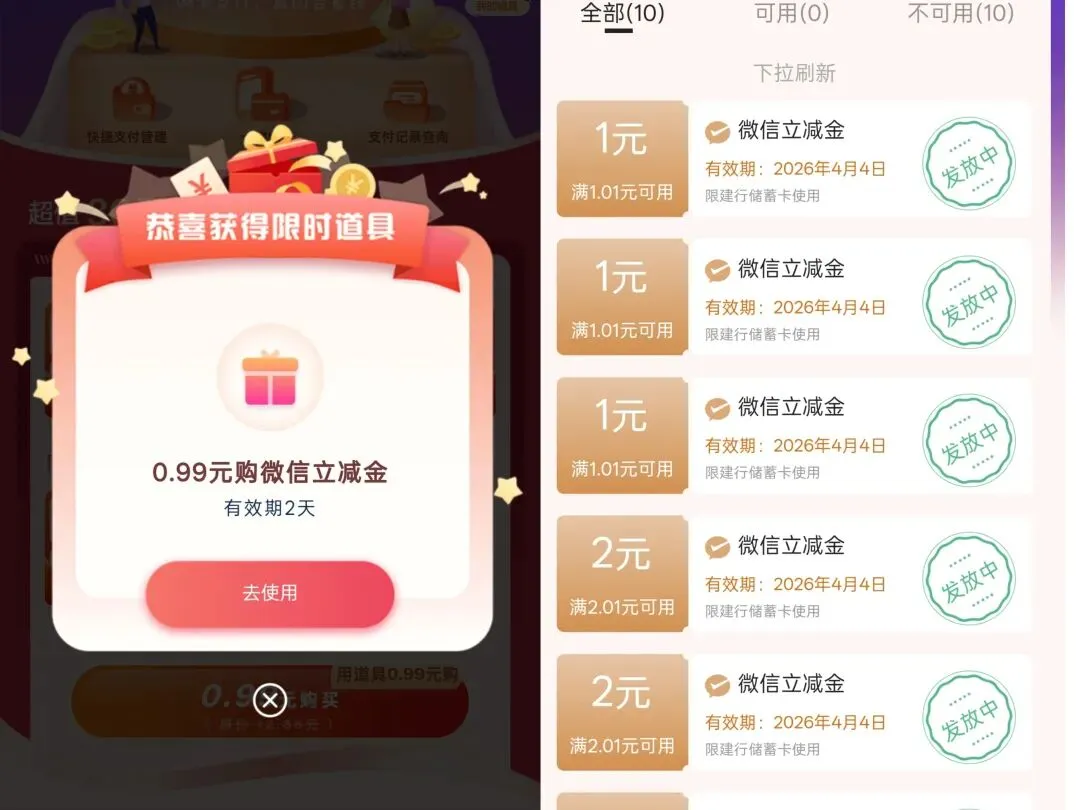 建行APP放水!0.99元拿下36元微信立减金,又随手抽中3元~