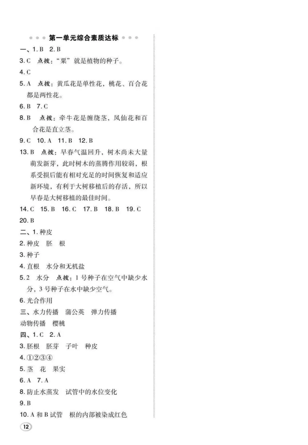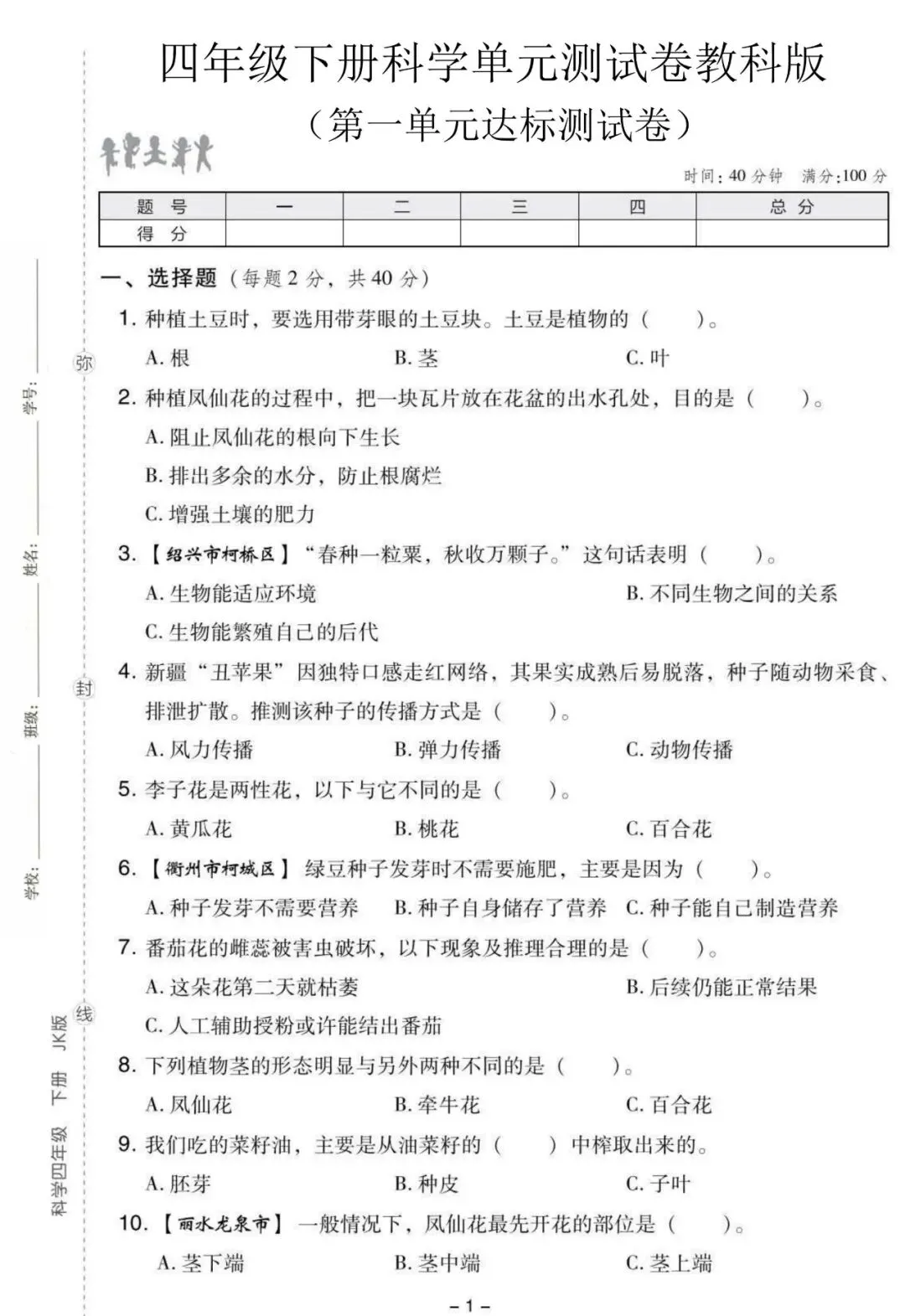 26年春四年级下册教科版科学《第一单元达标测试卷》,电子版可打印(有答案)