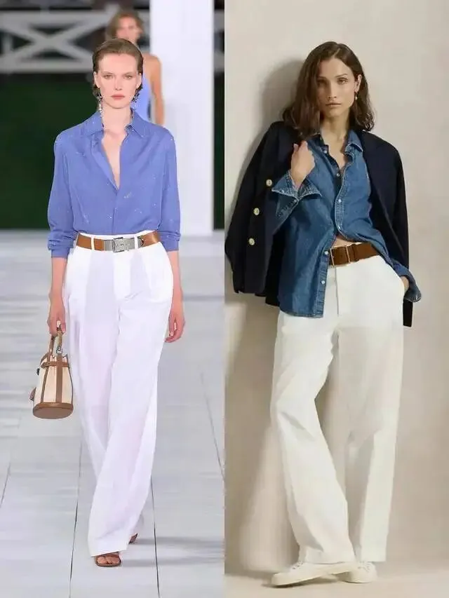 蓝衬衫配白色西装阔腿裤,再搭上同色系大地色凉鞋与腰带,腰线一收,整个人立刻挺拔修长,显高又显瘦。