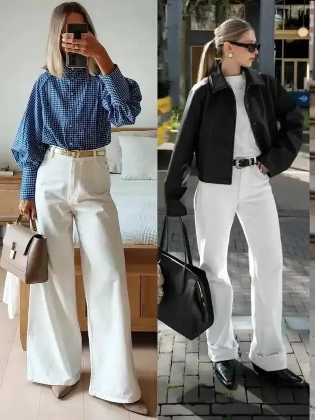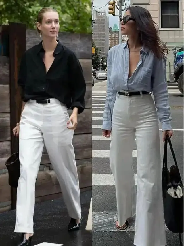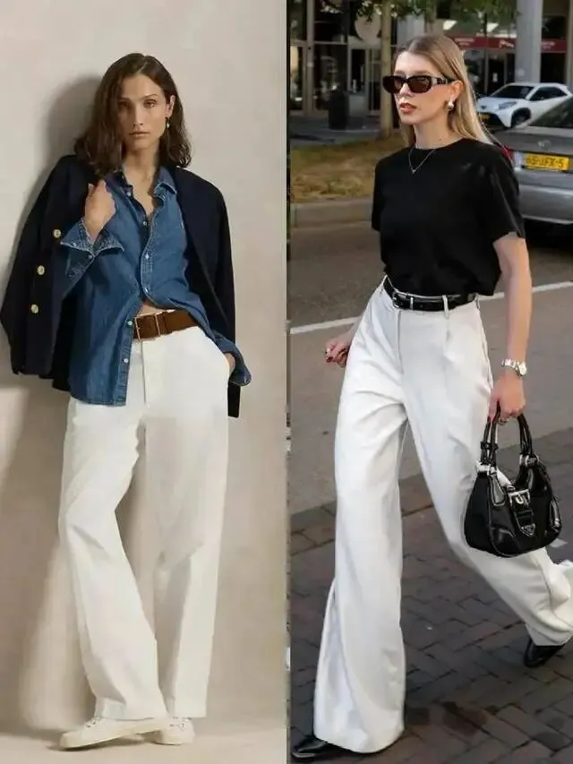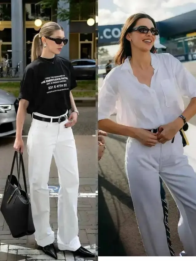 白裤子能成为春日的时尚宠儿从不是偶然,它百搭耐看,与任何色彩都能相融相生。例如上图两套穿搭,用黑色衬衫配白色西装裤,沉稳利落。