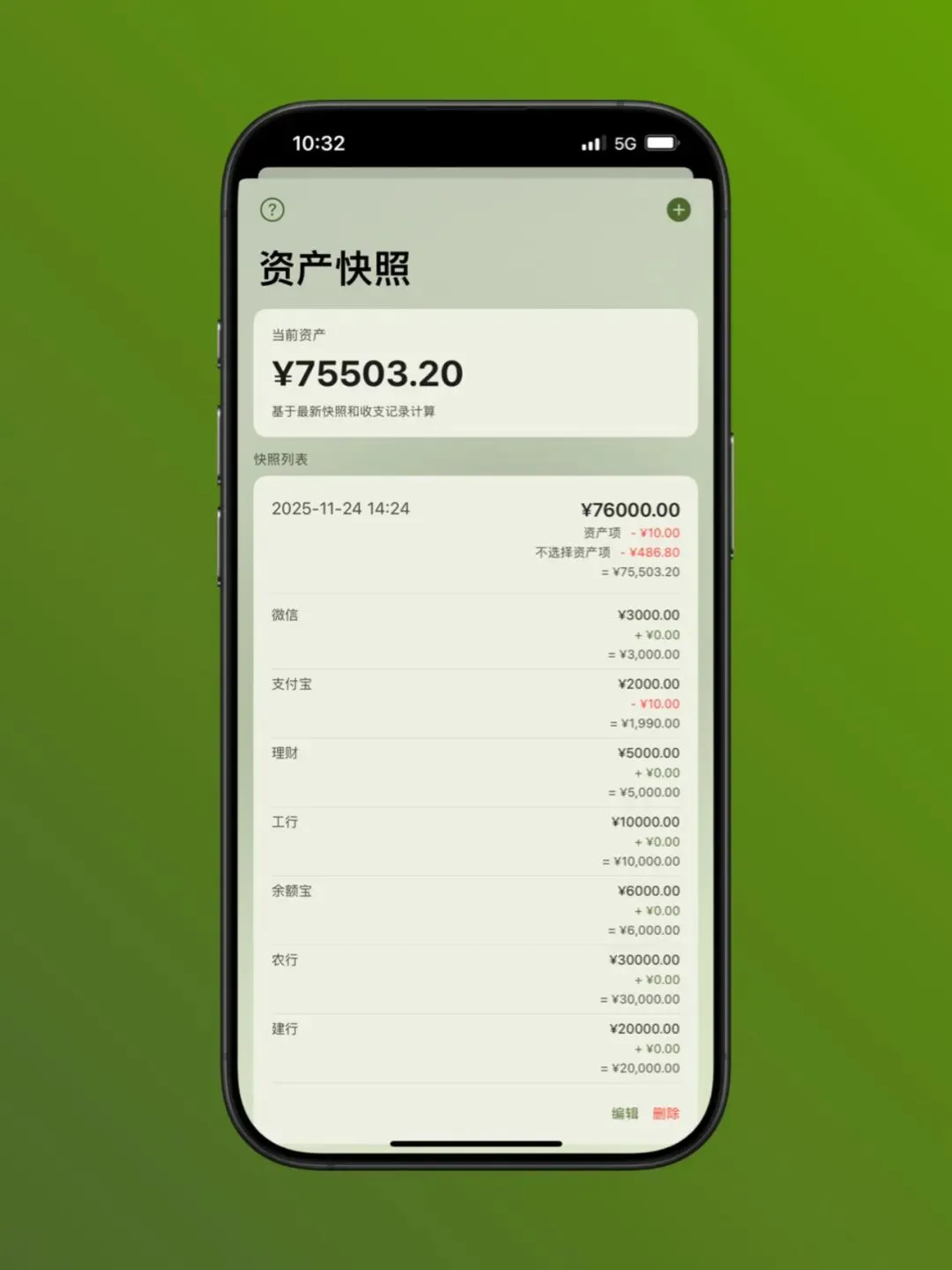 打开「记钱钱」的【资产快照】,把所有银行卡、微信、支付宝钱都加进去。
