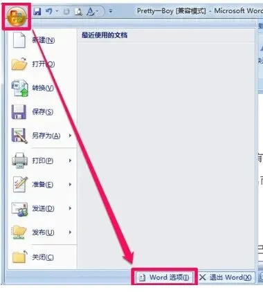 1.打开word文档,点击左上角的Office按钮,然后选择word选项。