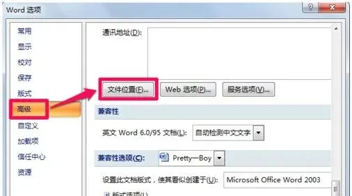 2.在word选项中选择高级,然后在右侧拖动滑块找到文件位置。
