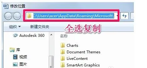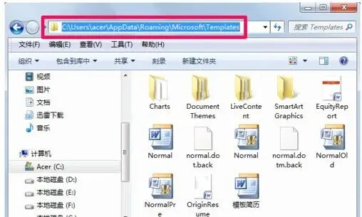 4.复制对话框中的word模板文件路径“C:\Users\acer\AppData\Roaming\Microsoft\Templates”。